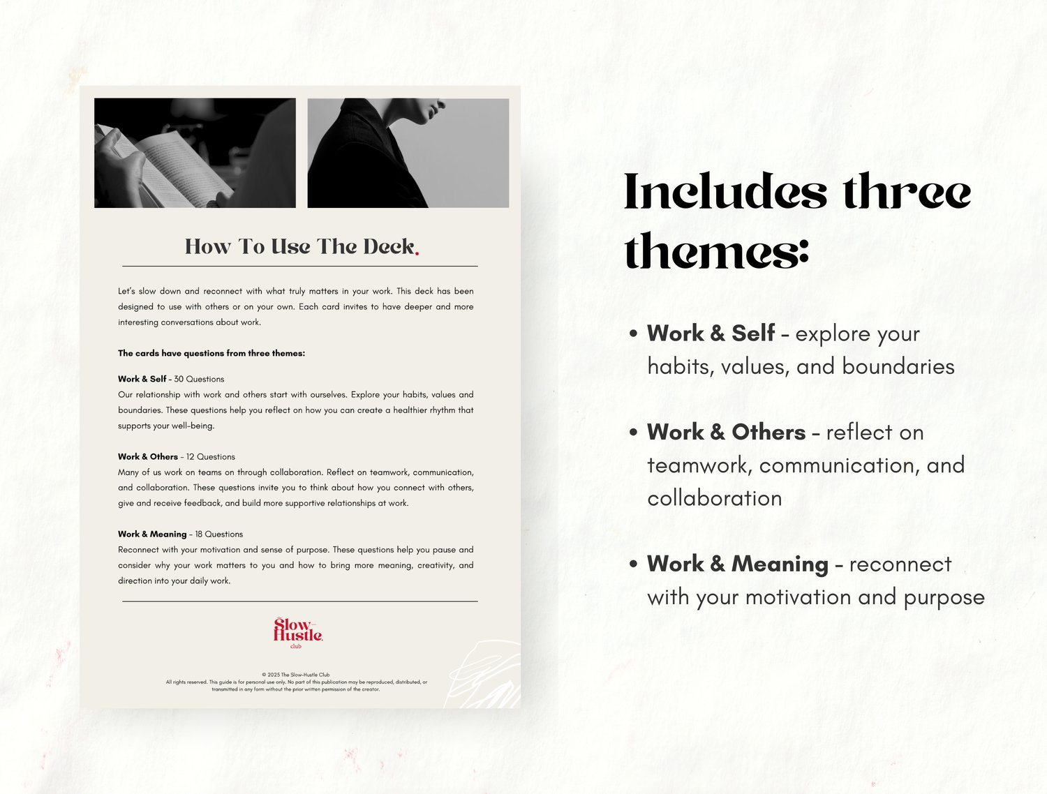 Find more meaning in your workdays with The Work Reflection Deck: a set of 30 beautifully designed cards featuring 60 thought-provoking questions about work, purpose, and balance.