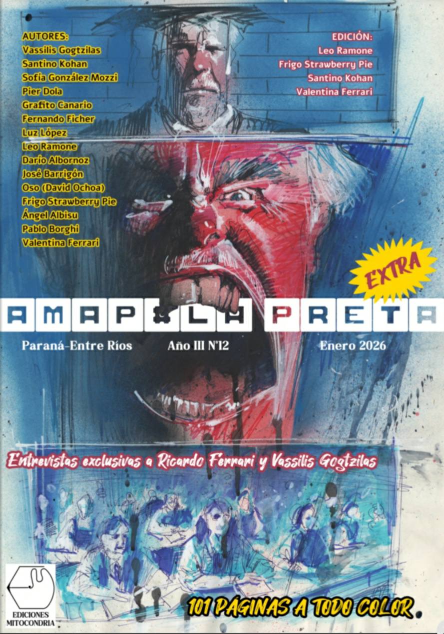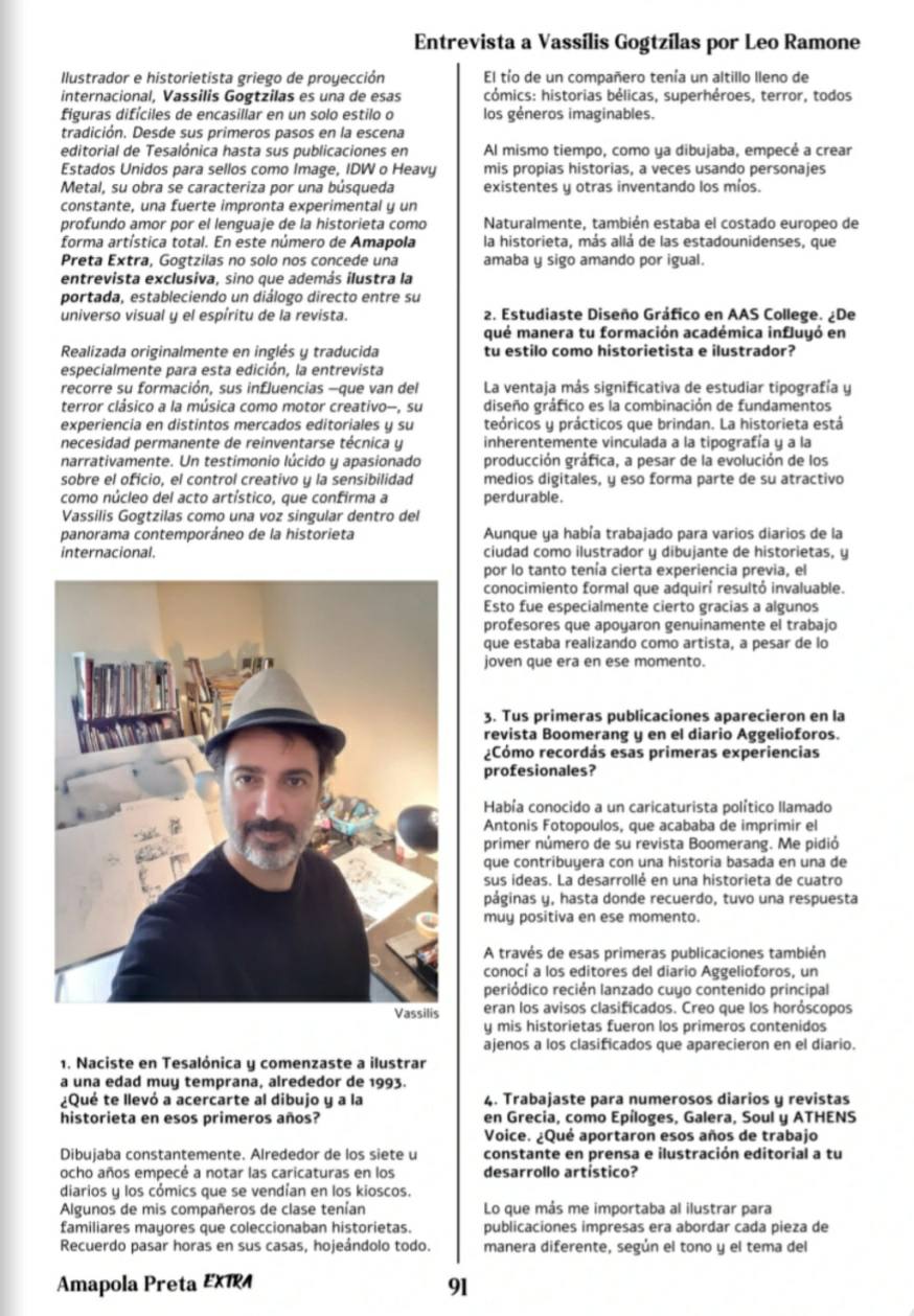 Illustrator and comic artist of international standing, Vassilis Gogtzilas is one of those figures who are difficult to confine to a single style or tradition. From his early steps in the Thessaloniki publishing scene to his publications in the United States for imprints such as Image, IDW, or Heavy Metal, his work is defined by a constant search, a strong experimental imprint, and a profound love for the language of comics as a total artistic form. In this extra issue of AMAPOLA PRETA, Gogtzilas not only grants us an exclusive interview, but also illustrates the cover, establishing a direct dialogue between his visual universe and the spirit of the magazine.
