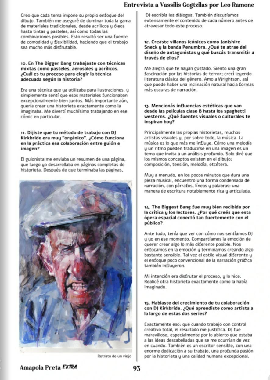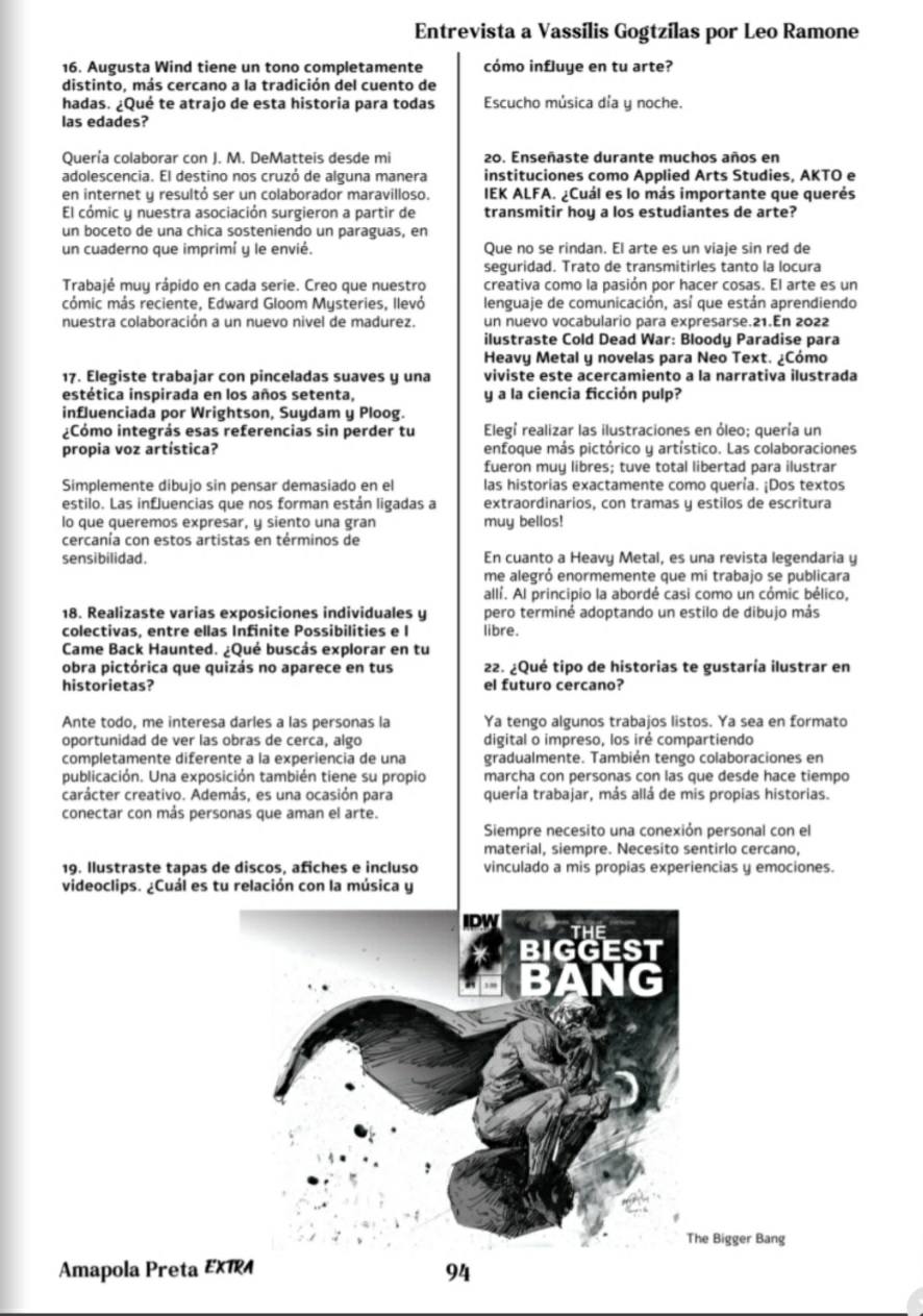 Originally conducted in English and specially translated for this edition, the interview traces his training and influences—ranging from classic horror to music as a creative driving force—his experience across different publishing markets, and his constant need to reinvent himself both technically and narratively. A lucid and passionate testimony about craft, creative control, and sensitivity as the core of the artistic act, it confirms Vassilis Gogtzilas as a singular voice within the contemporary landscape of international comics.