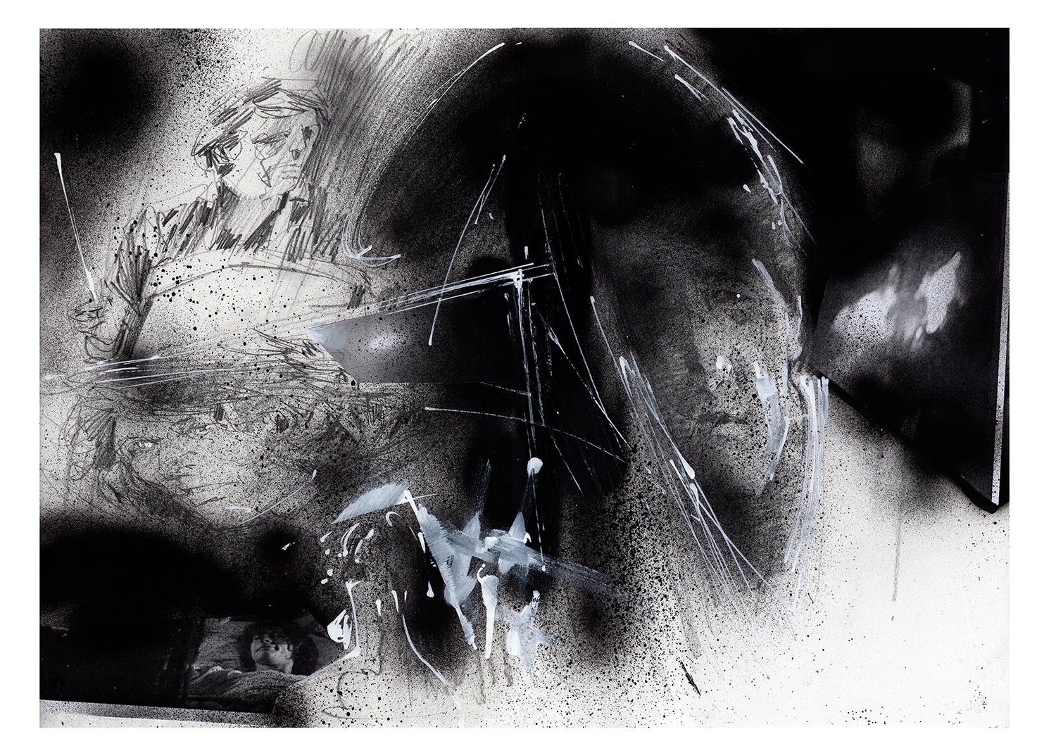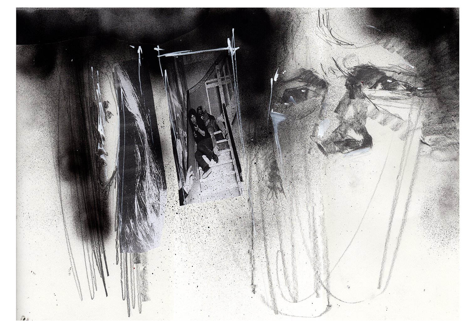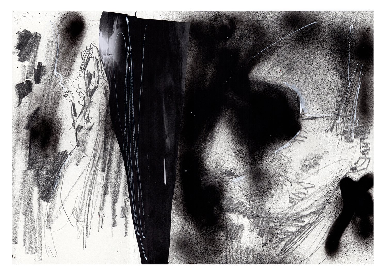 Pencils, graphite, spray paint, acrylics and collage.