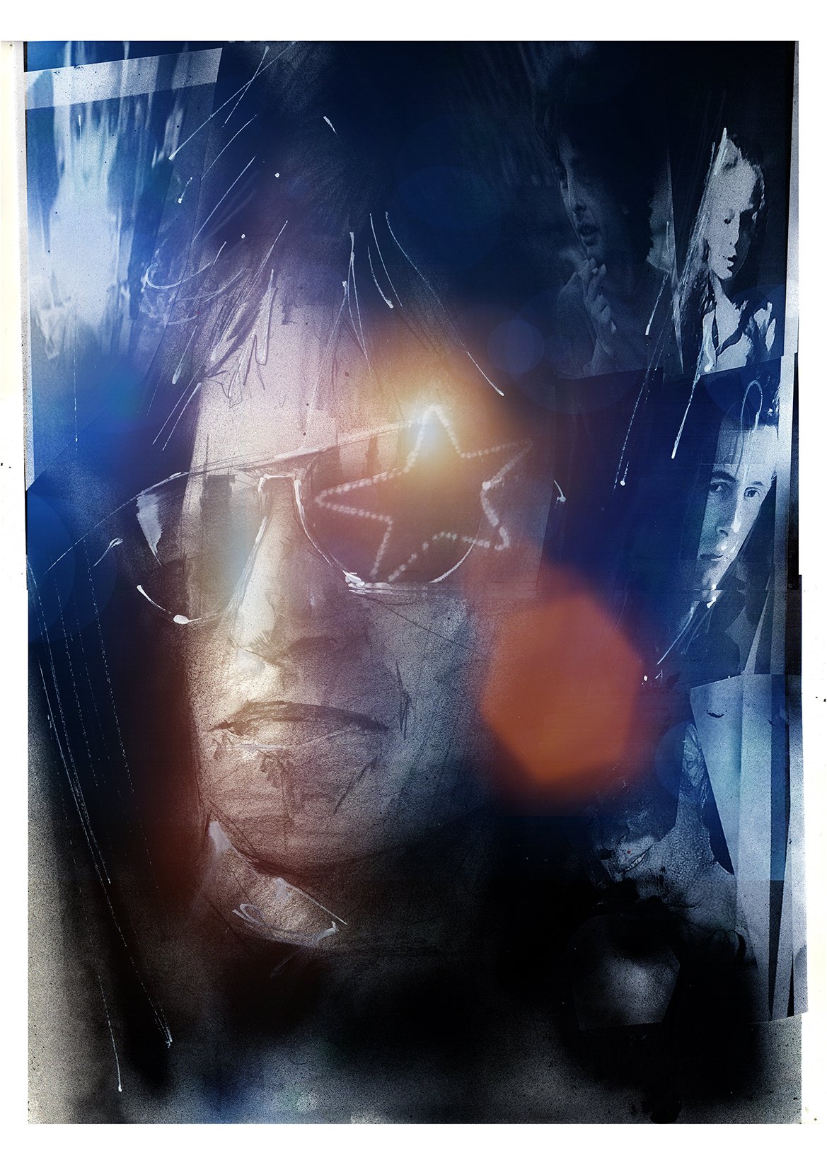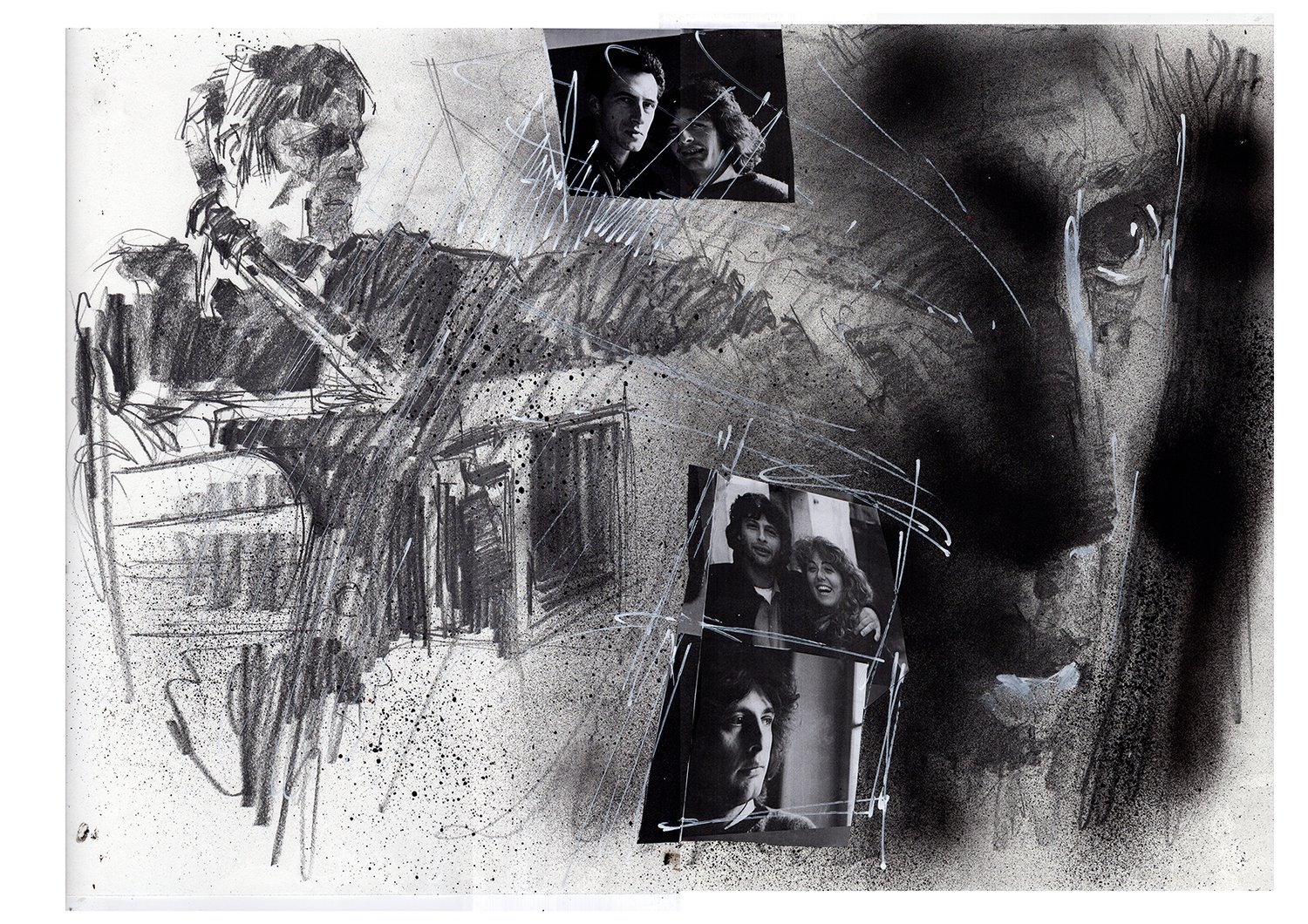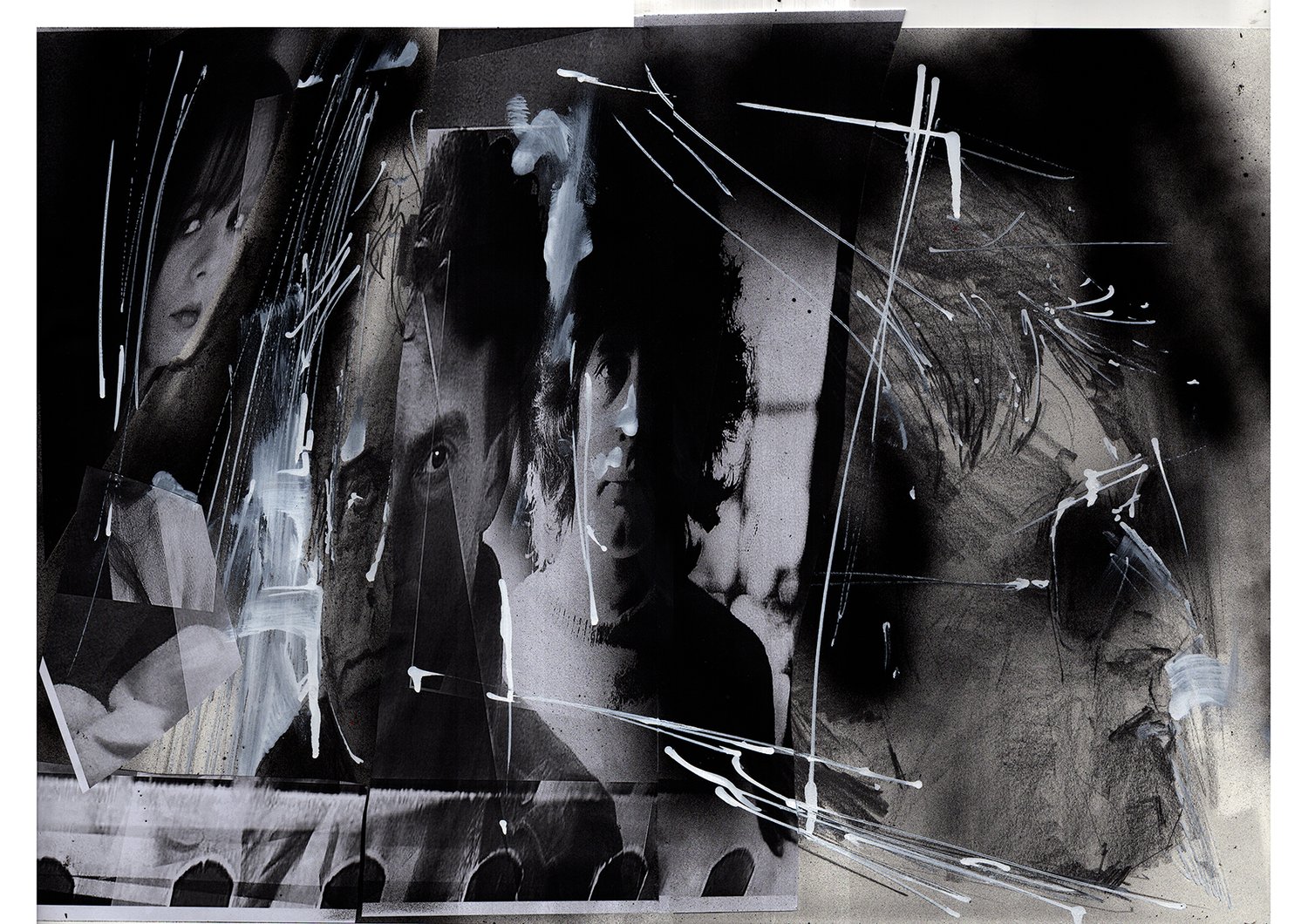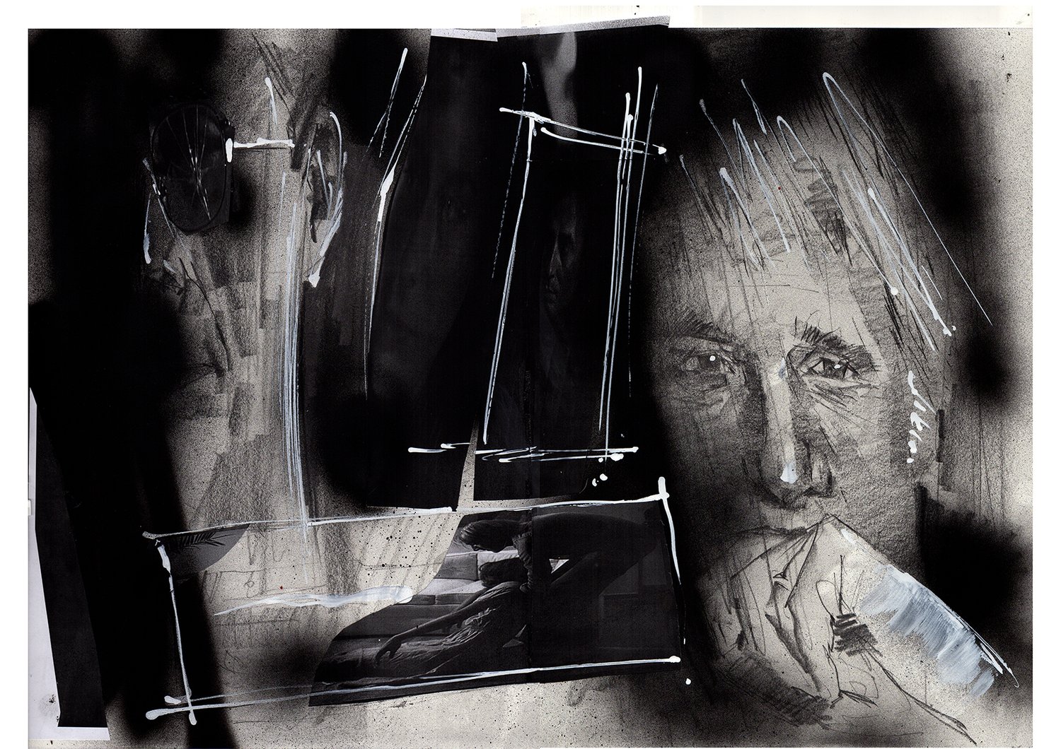 Pencils, graphite, spray paint, acrylics and collage.