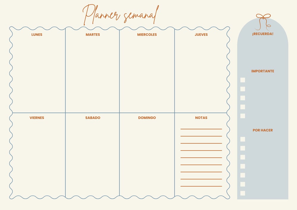 Organiza tu tiempo de forma sencilla con este planner semanal imprimible gratis. Diseñado para ayudarte a planificar de lunes a domingo, este planner es ideal para organizar tareas, compromisos y recordatorios de manera clara y práctica.