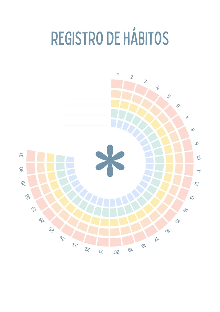 Este diseño circular te permite seguir hasta 5 hábitos durante todo el mes. Solo tienes que colorear o marcar cada día que cumplas tu hábito y, poco a poco, verás cómo se forma un patrón visual que te motivará a seguir.