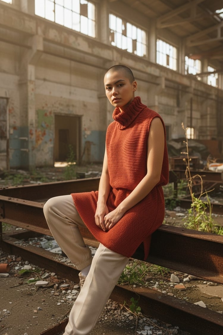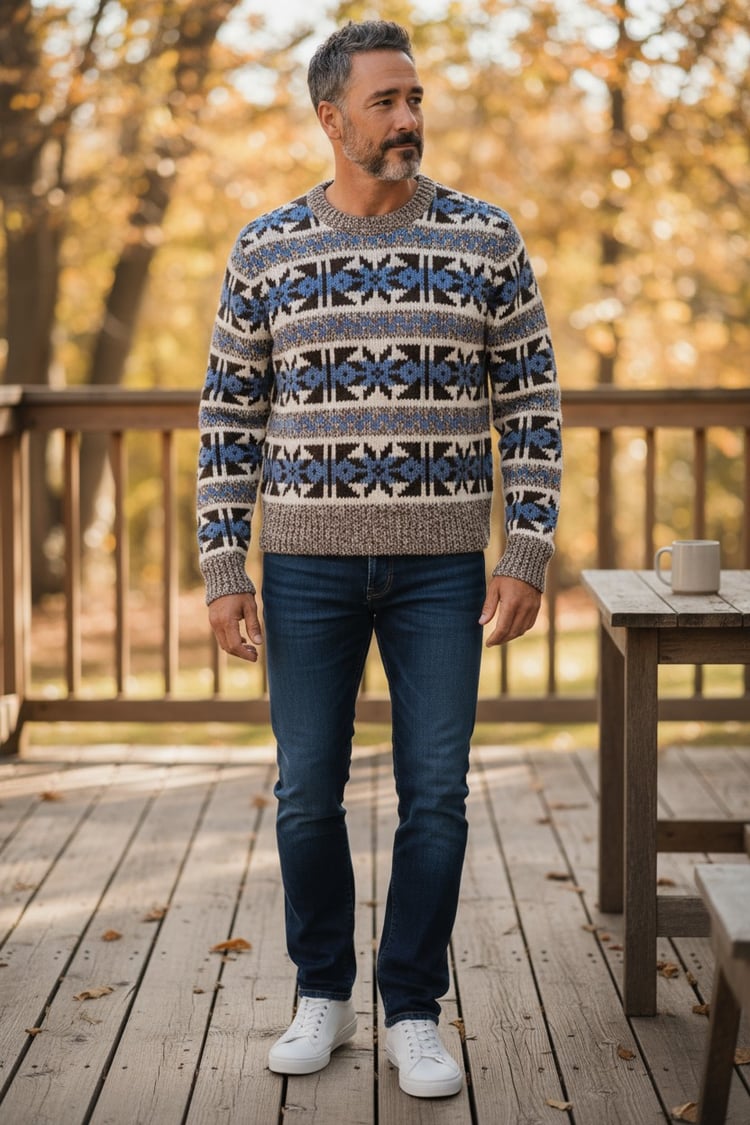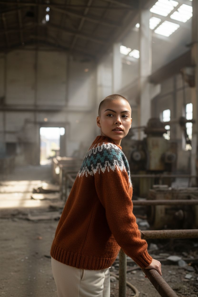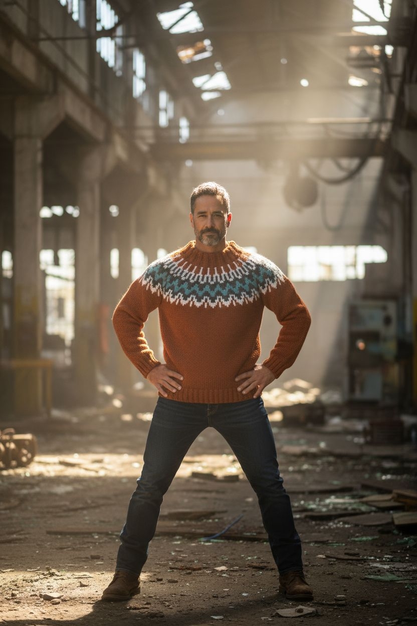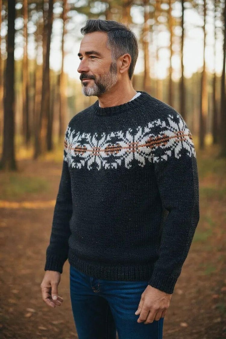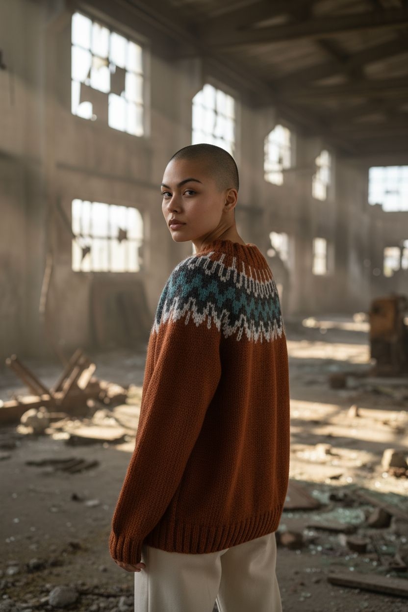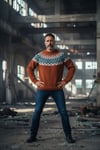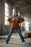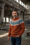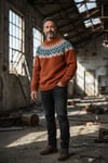 Cozy meets cool in this handmade Nordic-style yoke sweater. The bold geometric colorwork across the shoulders — combining burnt orange, teal, charcoal and white — gives it a timeless, artisan feel. Ribbed neckline, cuffs and hem for a perfect fit.