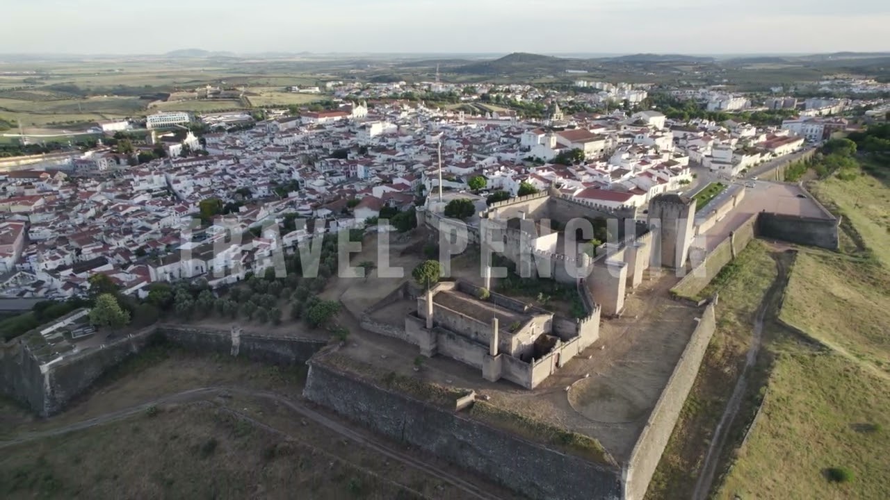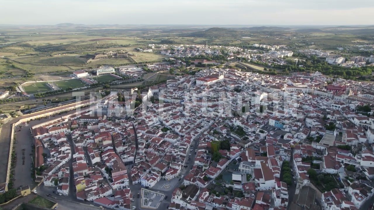 Professional 4K aerial drone footage of Elvas, Portugal. Cinematic views of historic fortifications, city walls, old town streets, and panoramic landscapes available for commercial licensing and instant download.