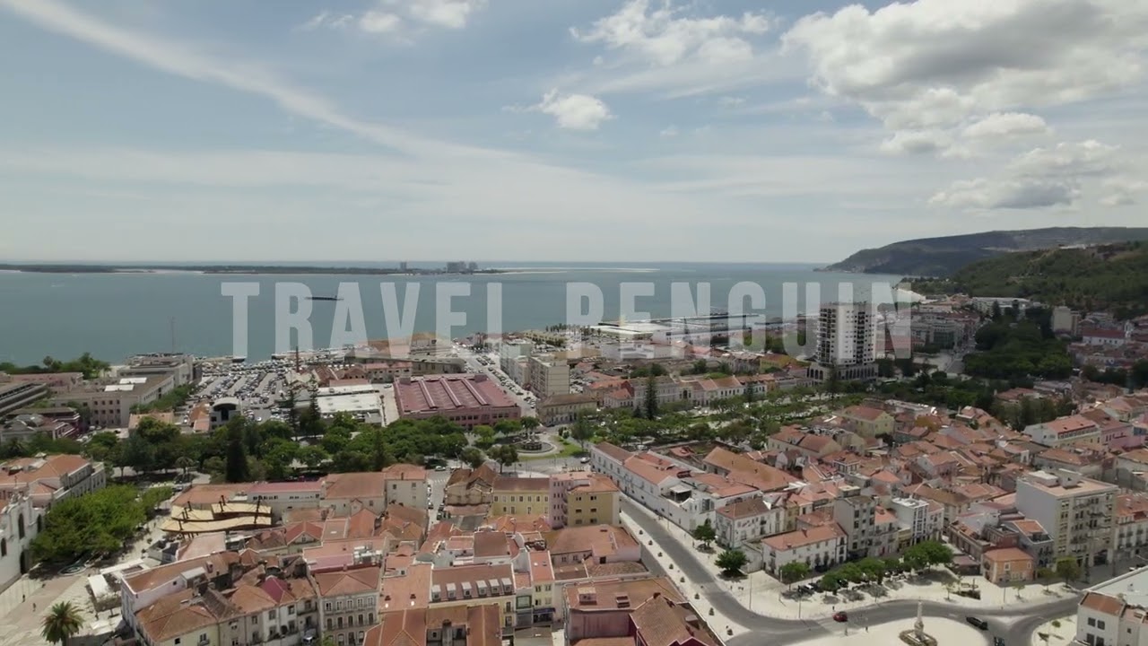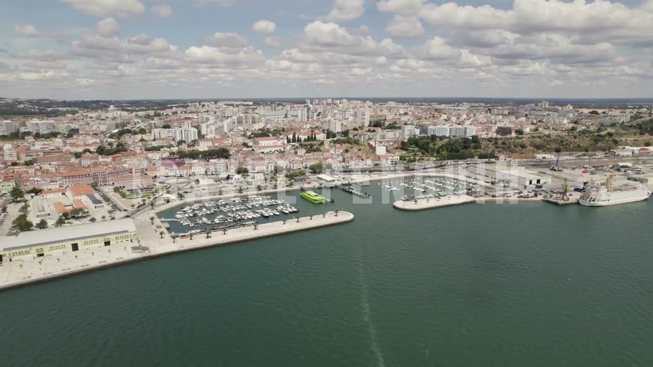 Professional 4K aerial drone footage of Setúbal, Portugal. Cinematic views of the coastal city, harbor, beaches, Serra da Arrábida, and panoramic Atlantic landscapes available for commercial licensing and instant download.
