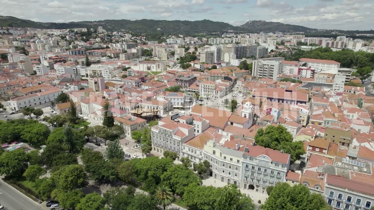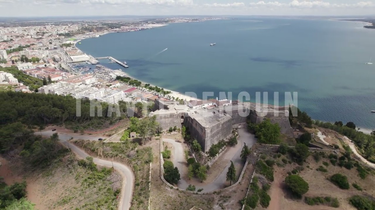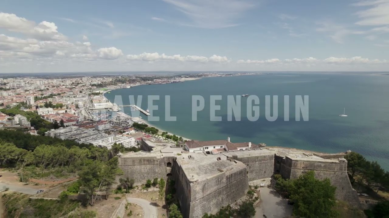 Professional 4K aerial drone footage of Setúbal, Portugal. Cinematic views of the coastal city, harbor, beaches, Serra da Arrábida, and panoramic Atlantic landscapes available for commercial licensing and instant download.