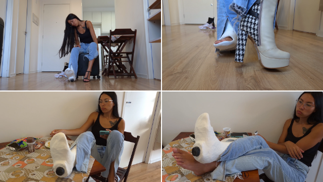 On her way back, carrying several shopping bags, she didn’t notice the “Caution: Wet Floor” sign placed by the cleaning lady. The next moment, she slipped, and one of the straps of her slipper came loose, causing her to fall along with the bags.