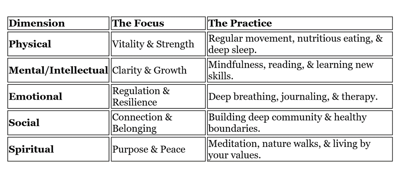 To achieve true "vibrancy," we have to look at wellness through a 360 degree lens. It’s not just about the gym! We can actually look at our Holistic Vitality (V) as the sum of our intentionality across these dimensions: