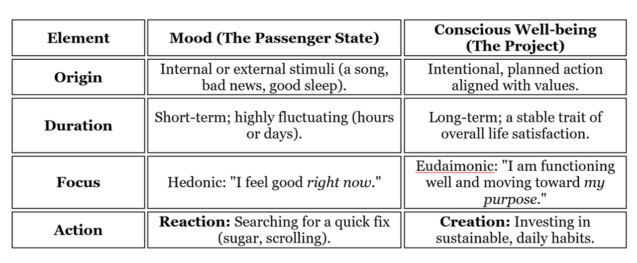 The core difference is simple but profound: Mood is hedonic (pleasure-seeking); well-being is eudaimonic (purpose-driven).