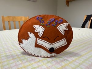 To compensate, she finished a much easier and less time-intensive, travel-friendly project for September: a "Foxy" lavendar sachet made from felted wool with embroidery. Time management, right?
