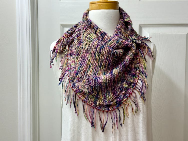 And for the month of October, her project is the Prairie Hills Shawl, designed by Sarah Schira. This project uses one skein of sock yarn (exactly) and has a built in, unravel-able, fringe. Cynthia chose a space-dyed yarn from Over the Moon Yarns called "Glitch in the Matrix". She loves the speckled variety of colour in the mainly garter stitch pattern of this project. And, it's finished! Cynthia said, "I love this Year of Finished Objects idea. It's motivating me to work through not only what I've started and failed to finish, but also to add variety to my craft pursuits, like spinning, weaving, crochet and embroidery. I'm really motivated to try this again: one project each month is a great goal for me."