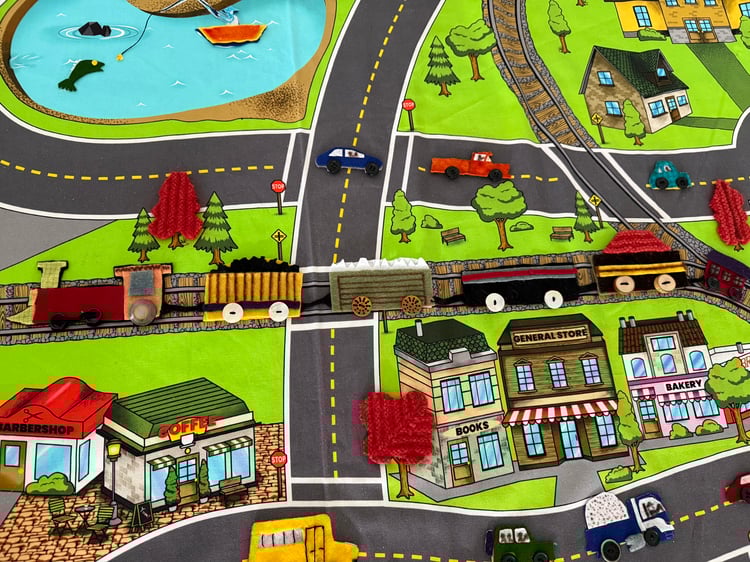 In the latest yarn art installation, Barb has taken a kids play mat with roads, train tracks and ponds as the backdrop on the pole. She then added trains, cars, boats, fish, trees and more to the “scene”. All the additions are lovingly crafted from felt and/or knitted or crocheted with yarn. It really brightens up the pole and creates a fun and “touchable” art installation that brings smiles to passers-by. These changing scenes on the poles create a conversation starter for residents and visitors to the neighbourhood.