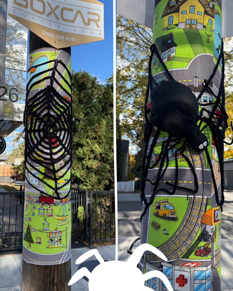 The Calder neighbourhood has been a place of neighbourhood renewal, instigated and fulfilled by community members. It's really powerful to see your friends and neighbours take pride in themselves and their surroundings. Barb's contributions have been a wonderful catalyst. She's been "yarn bombing" an aging telephone pole located on a mixed residential & commercial street. She began by wrapping the pole with an underwater scene and replaced it with a street scene featuring transportation, particularly trains.