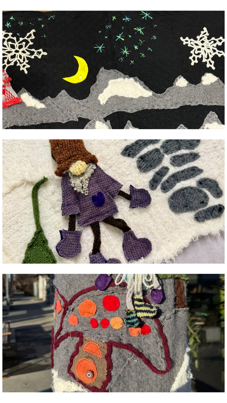 The stars were embroidered on the sky with a shiny metallic ribbon. Snowflakes were knit and crocheted, and the black sky was a knitted fabric panel that I made on my knitting machine, using a subtle pattern (tuck stitch) to simulate clouds and give the sky some movement and texture. The moon was cut out of bright yellow felt, and sewn into place. The snow covered mountains were cut out from knitted sweaters and tacked down into place. The grey fabric was a Value Village find and the white was a brand new purchase from Winners. The trees were done in a similar way, by knitting a textured panel, and cutting out shapes and sewing them into place. The gnome houses were outlined with knitted i-cord, and embellished with felt accents. The gnome house doors and the wooden benches around the skating rink were constructed from fabric from an old placemat.