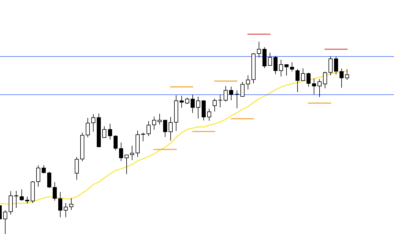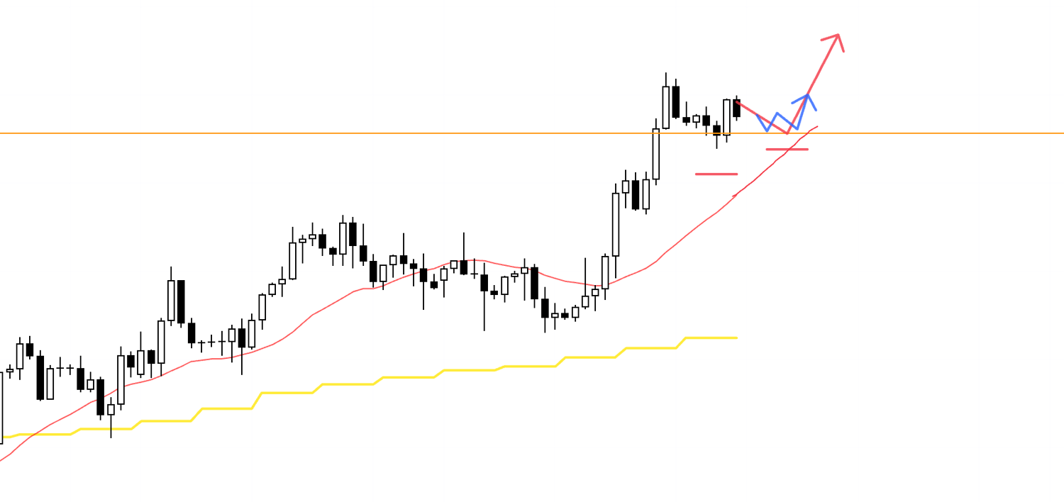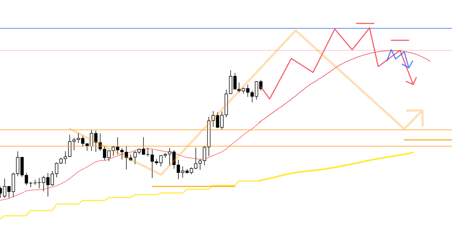 That said, there is a risk that any downside simply increases buying pressure, and the previous low is supported by the prior daily highs (orange line), so I want to judge based on whether an entry appears that offers a risk–reward profile that makes sense down to that level.