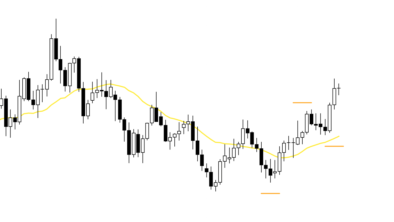 If, instead, the 4h chart starts to form higher lows like this and price begins to look supported by the moving averages, I will look to follow the move up as a pullback buy on the daily chart.