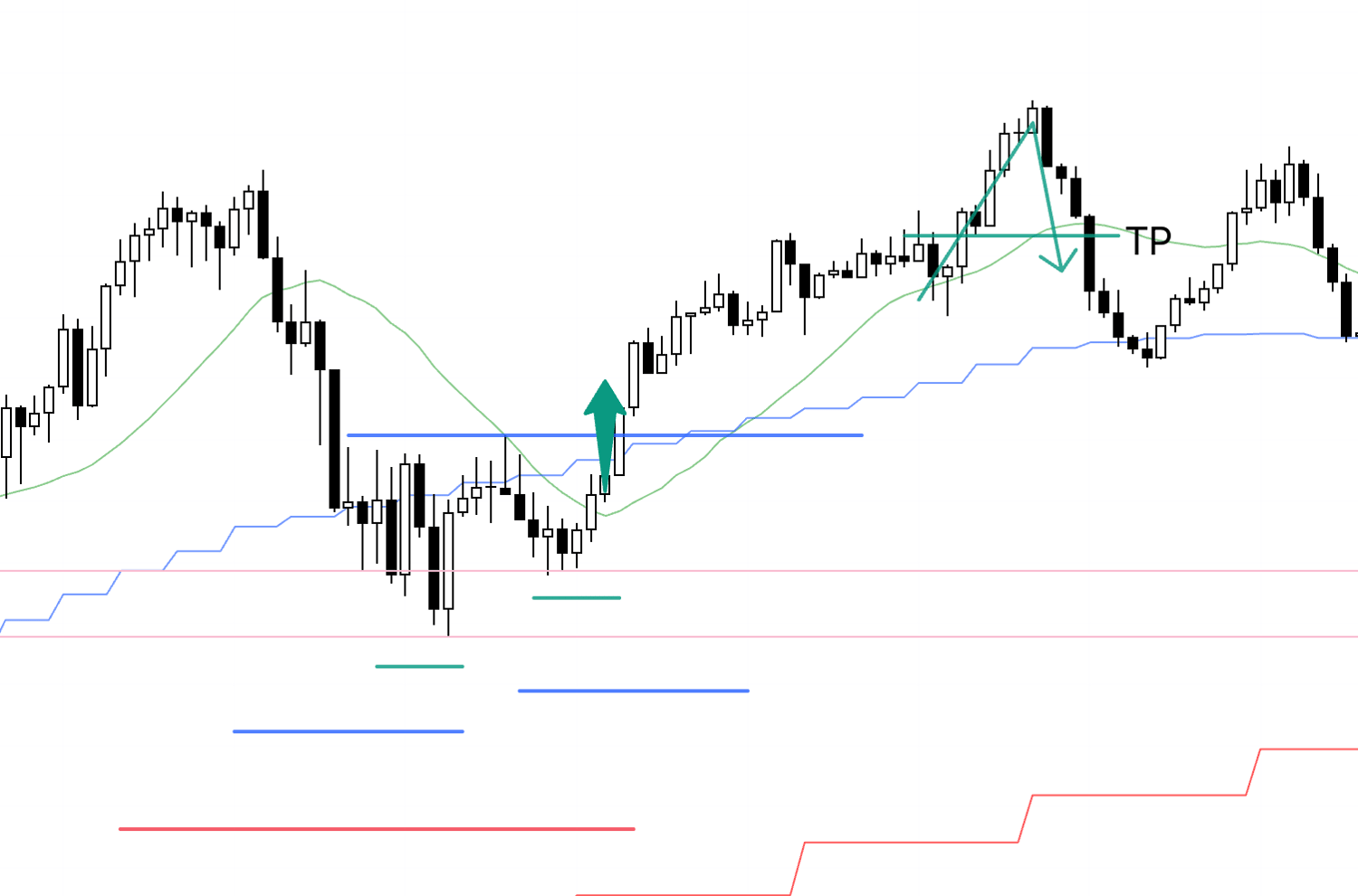 Within the 4h higher-low structure (red), the 1h lows are supported by prior highs and lows (pink lines), so the entry point is the breakout that takes out the most recent high (blue).