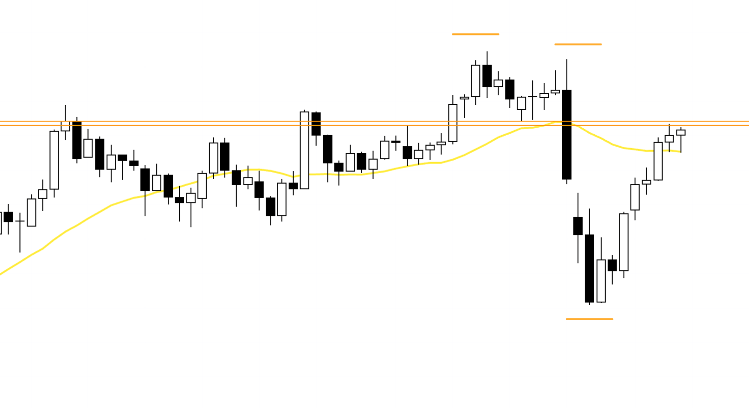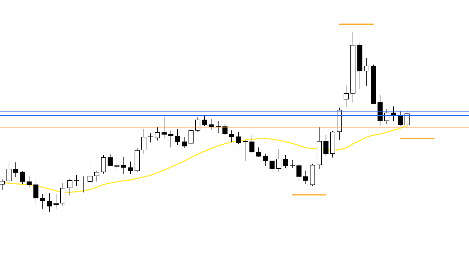 However, price remains below the previous high (blue line), indicating that bullish and bearish forces are in a standoff at current levels.