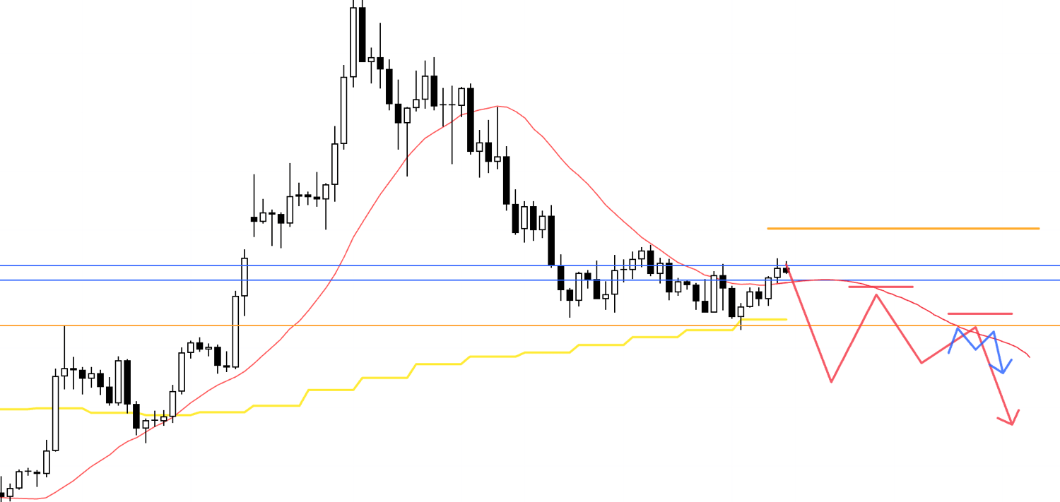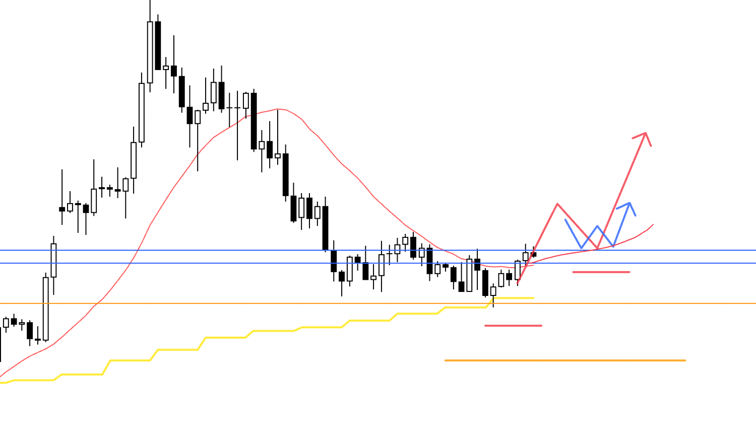 As things stand, price is being supported by the daily moving average (yellow) and the orange line, which makes it difficult to sell right away.