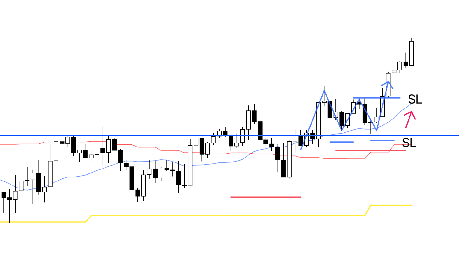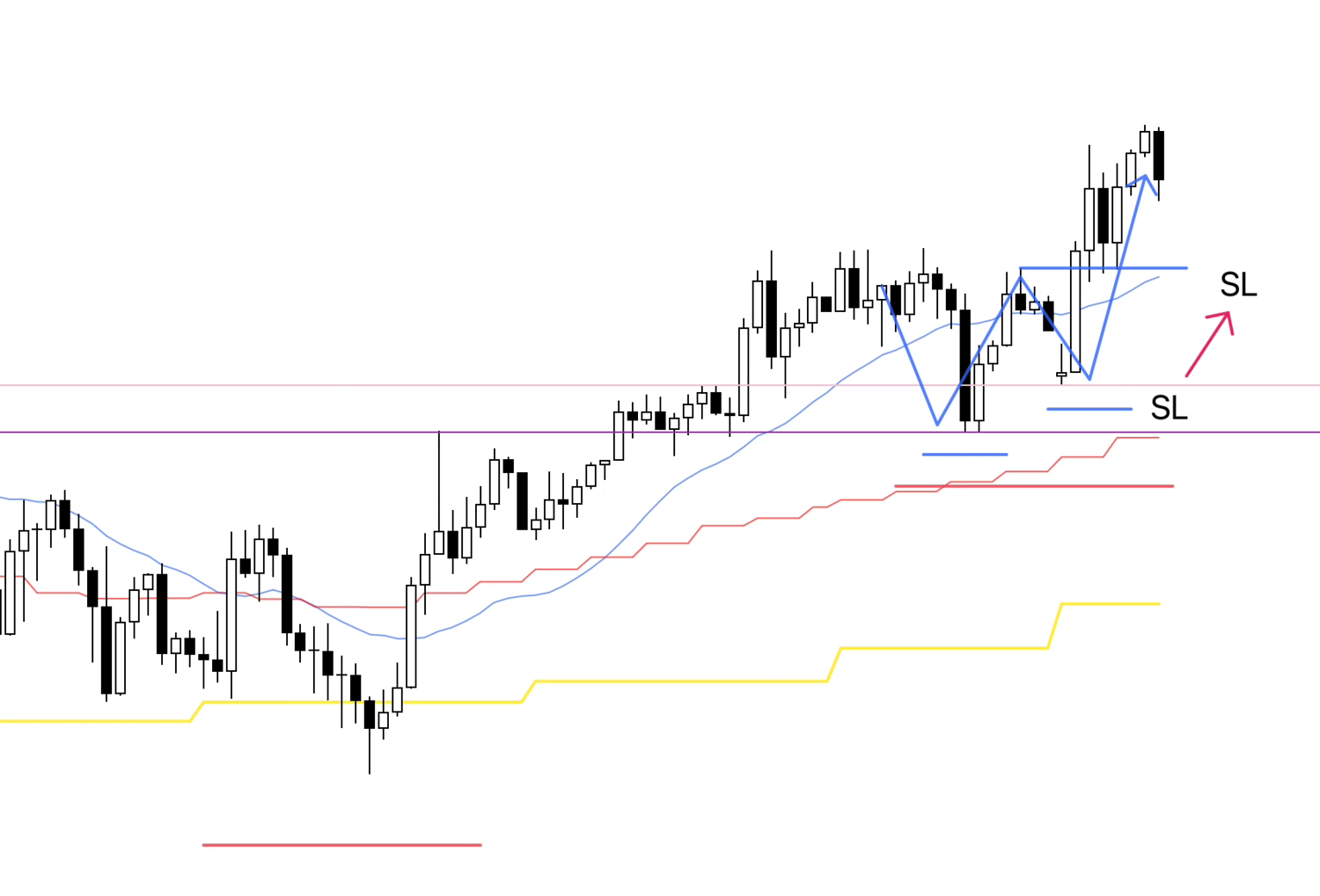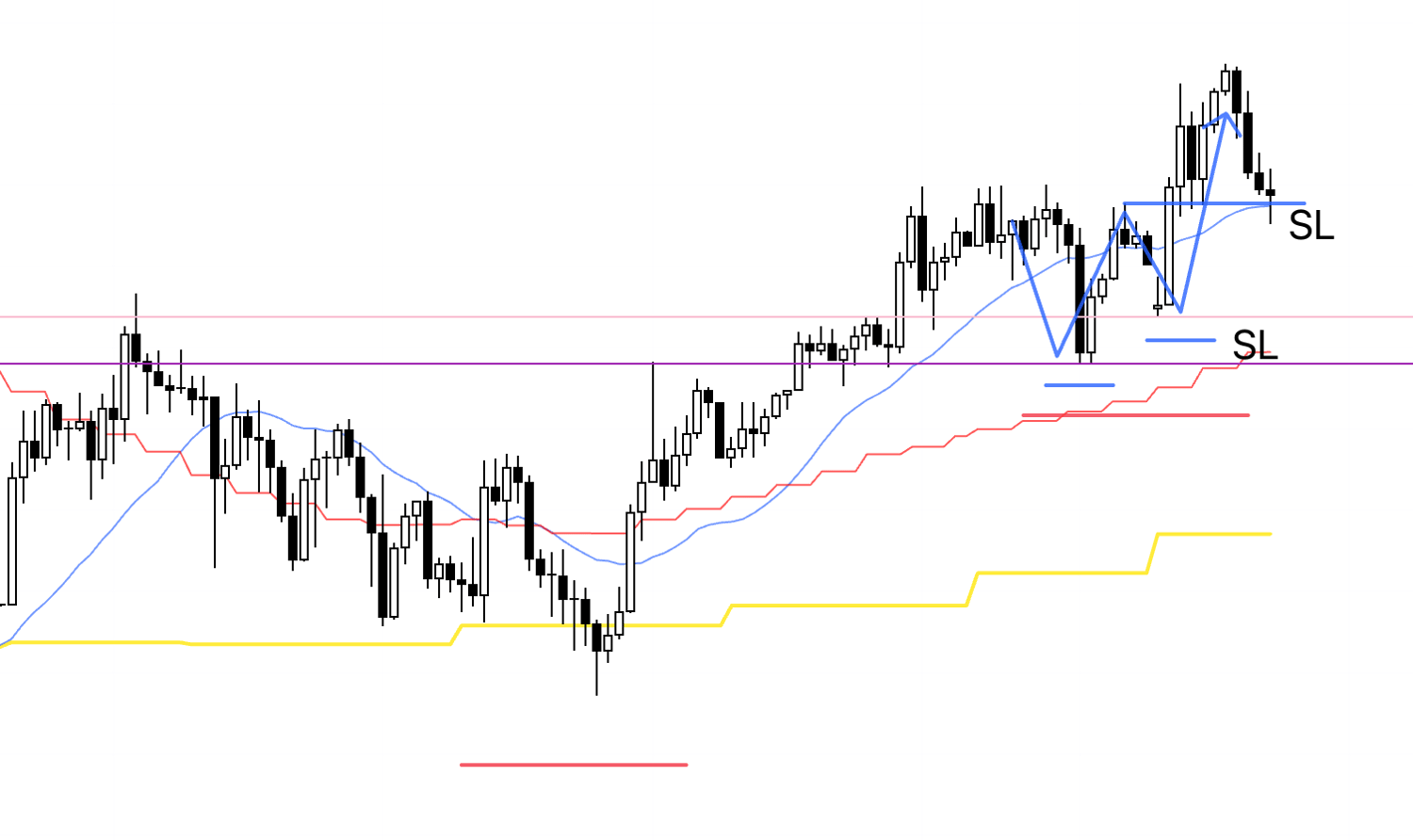 At this 4h higher-low point, the 1h is trying to start an uptrend, so I’ve placed a buy stop order.