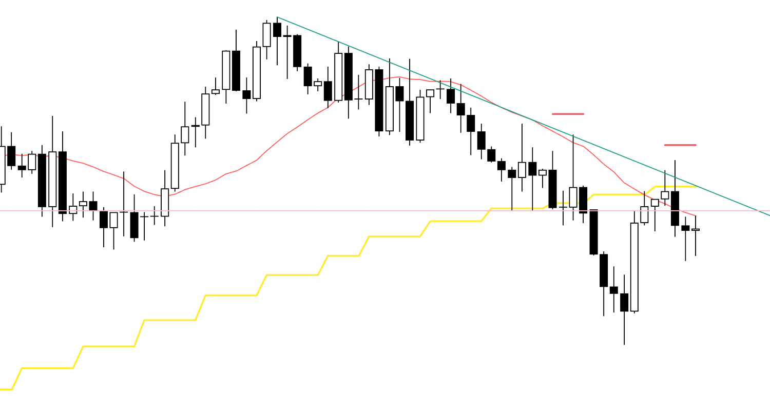 In that context, if price starts falling while being capped by the green trendline and also by the pink line, it is more likely to trigger a chain of sell orders, pulling in daily sell orders as well, which increases the downside edge.