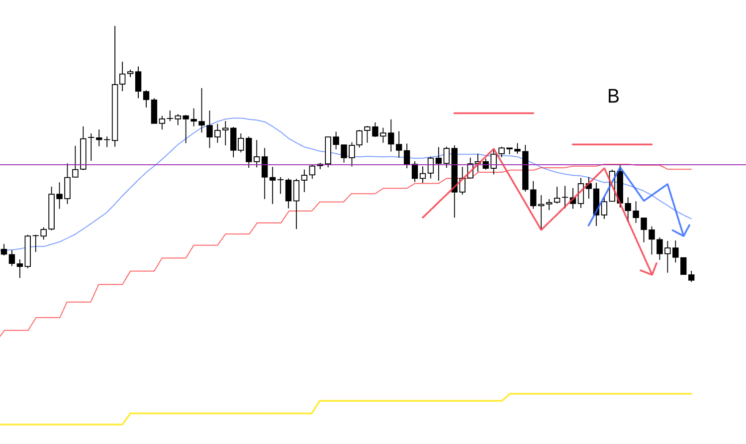 By the time we reached the situation at B, price had already broken below the red 4h moving average and was being capped from above, so I was planning to sell on a 1h lower high followed by a break of the prior low.