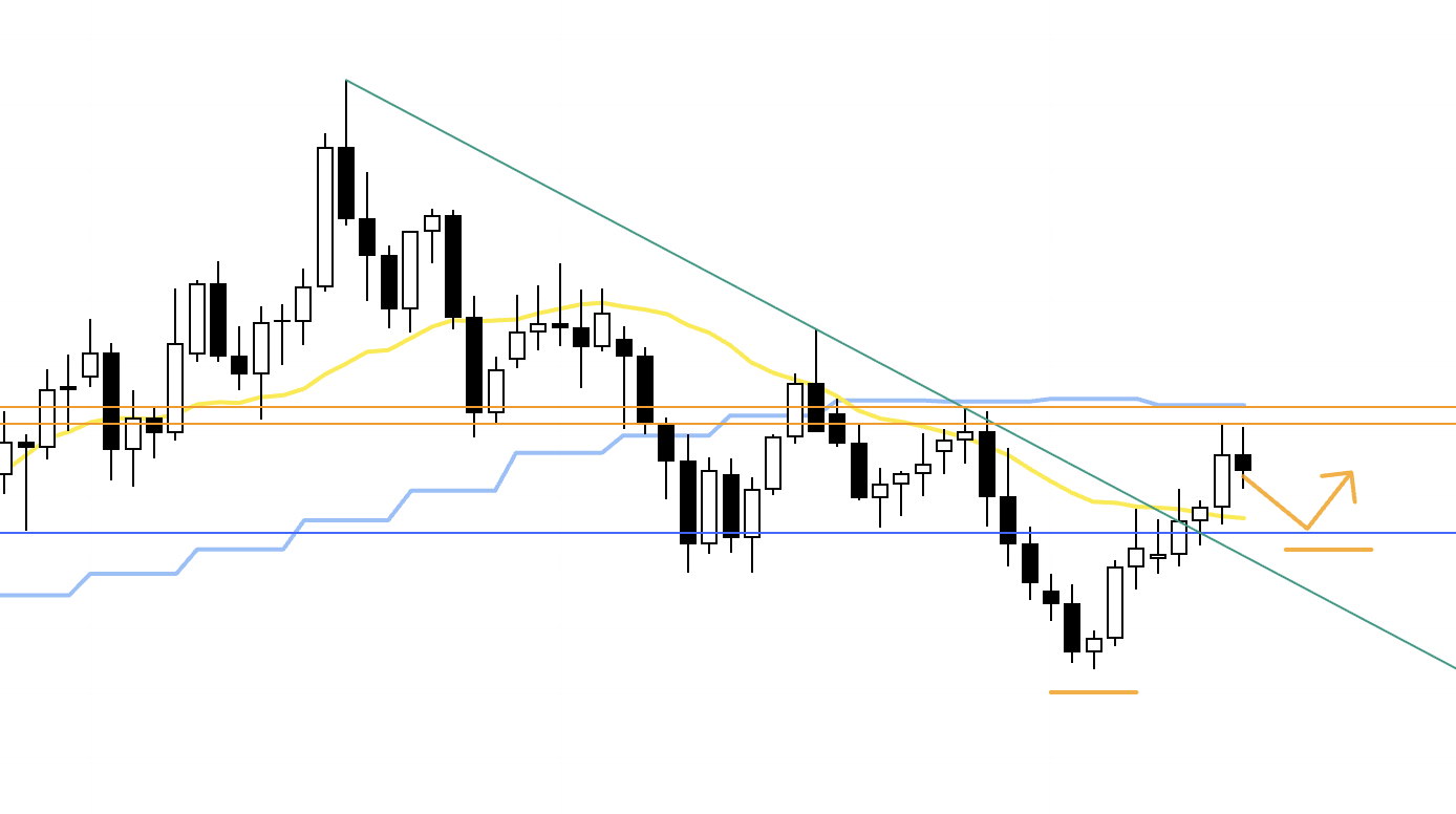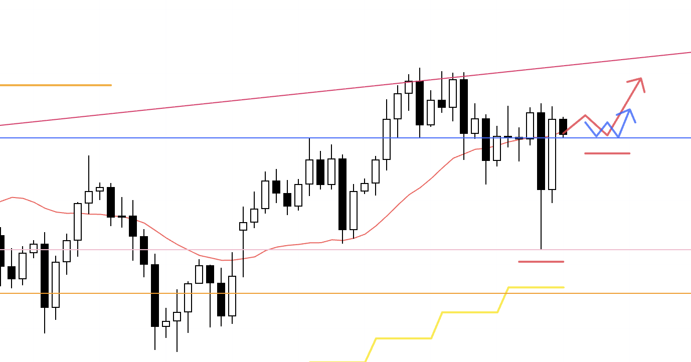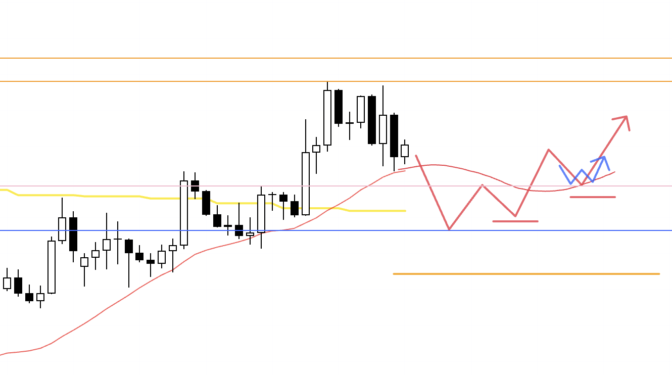 In that case, around the upper orange line there is a risk of increased weekly sellers stepping in, so the question is whether I can structure an entry with good risk–reward. If I do take a position, I plan to lock in half the profits around that line.
