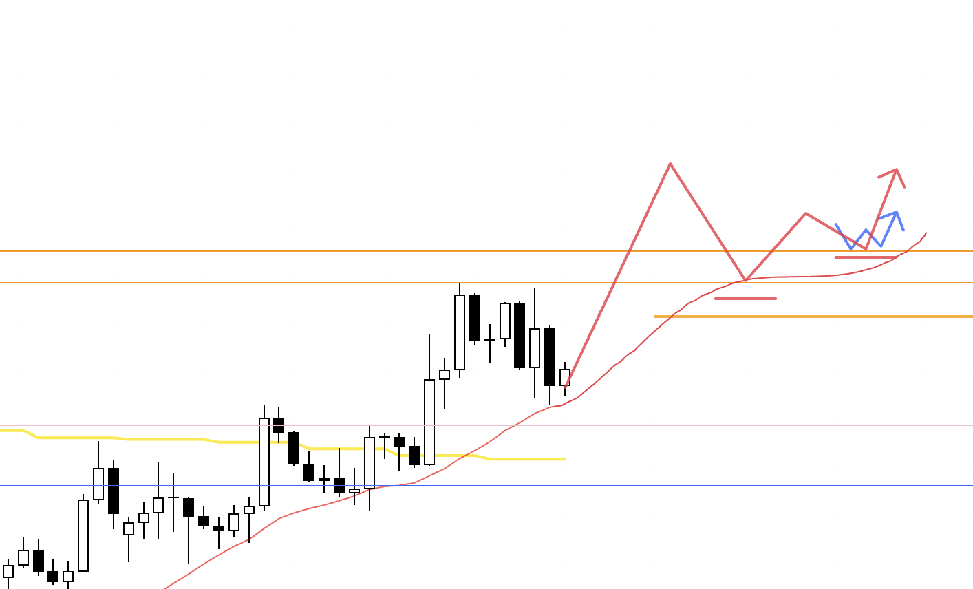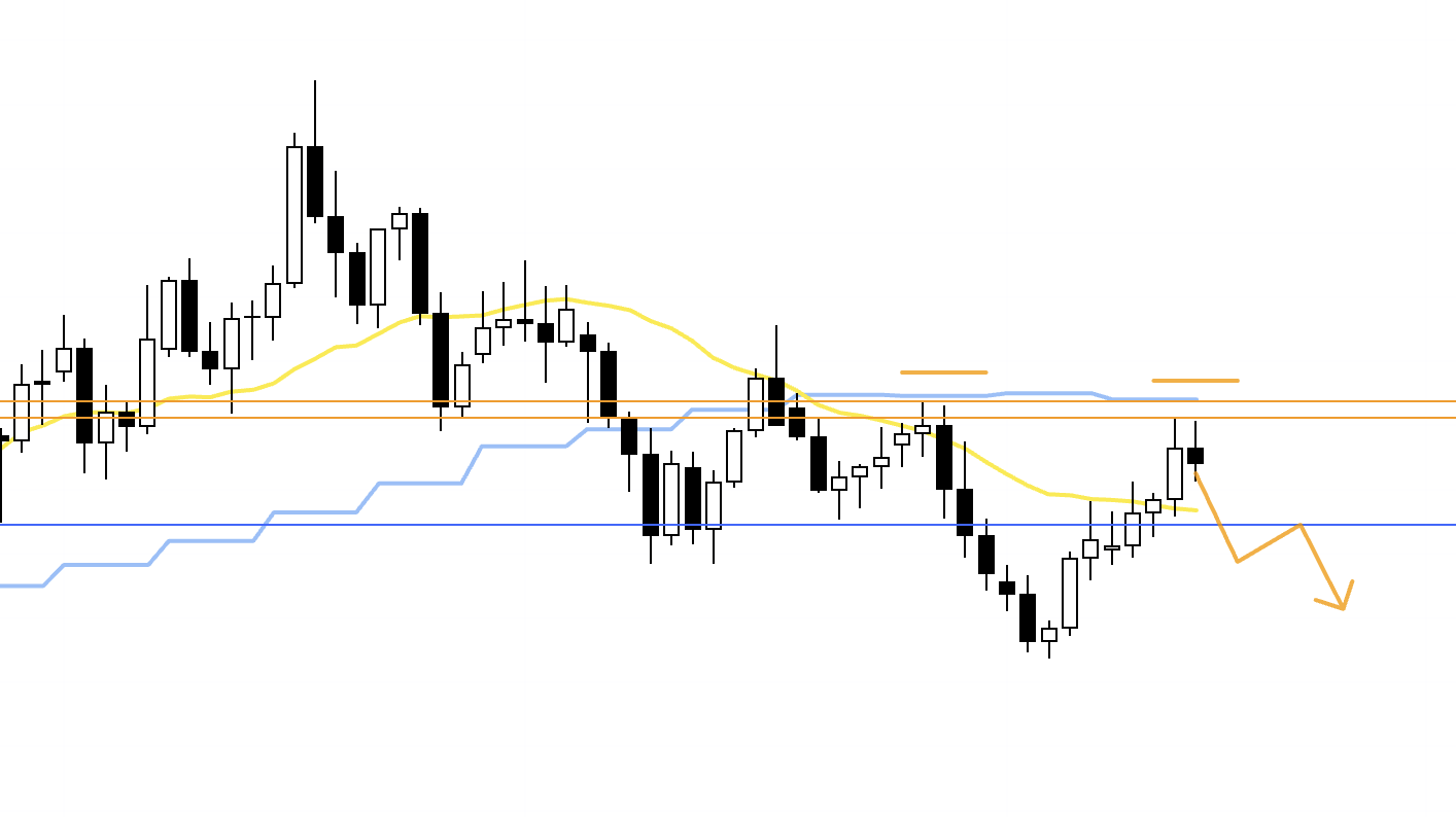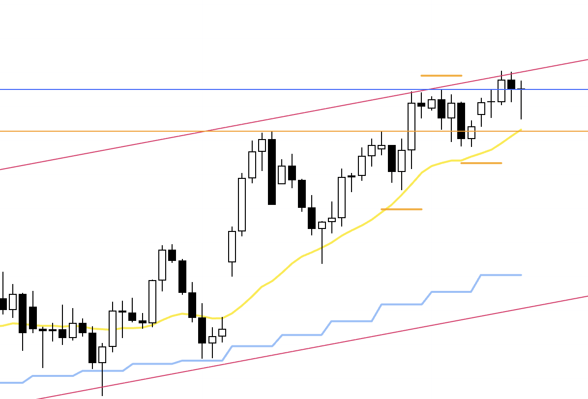In that case, around the upper orange line there is a risk of increased weekly sellers stepping in, so the question is whether I can structure an entry with good risk–reward. If I do take a position, I plan to lock in half the profits around that line.
