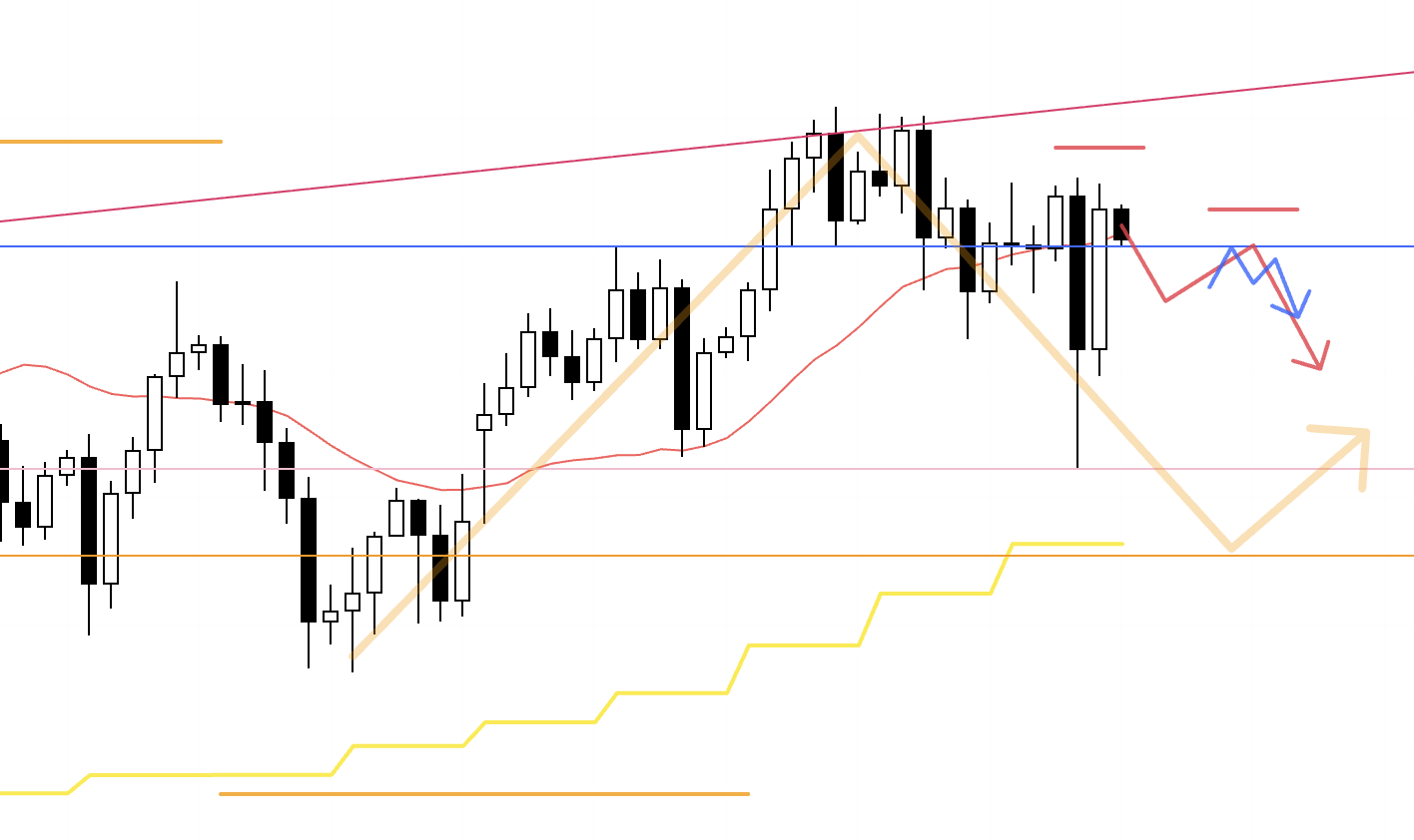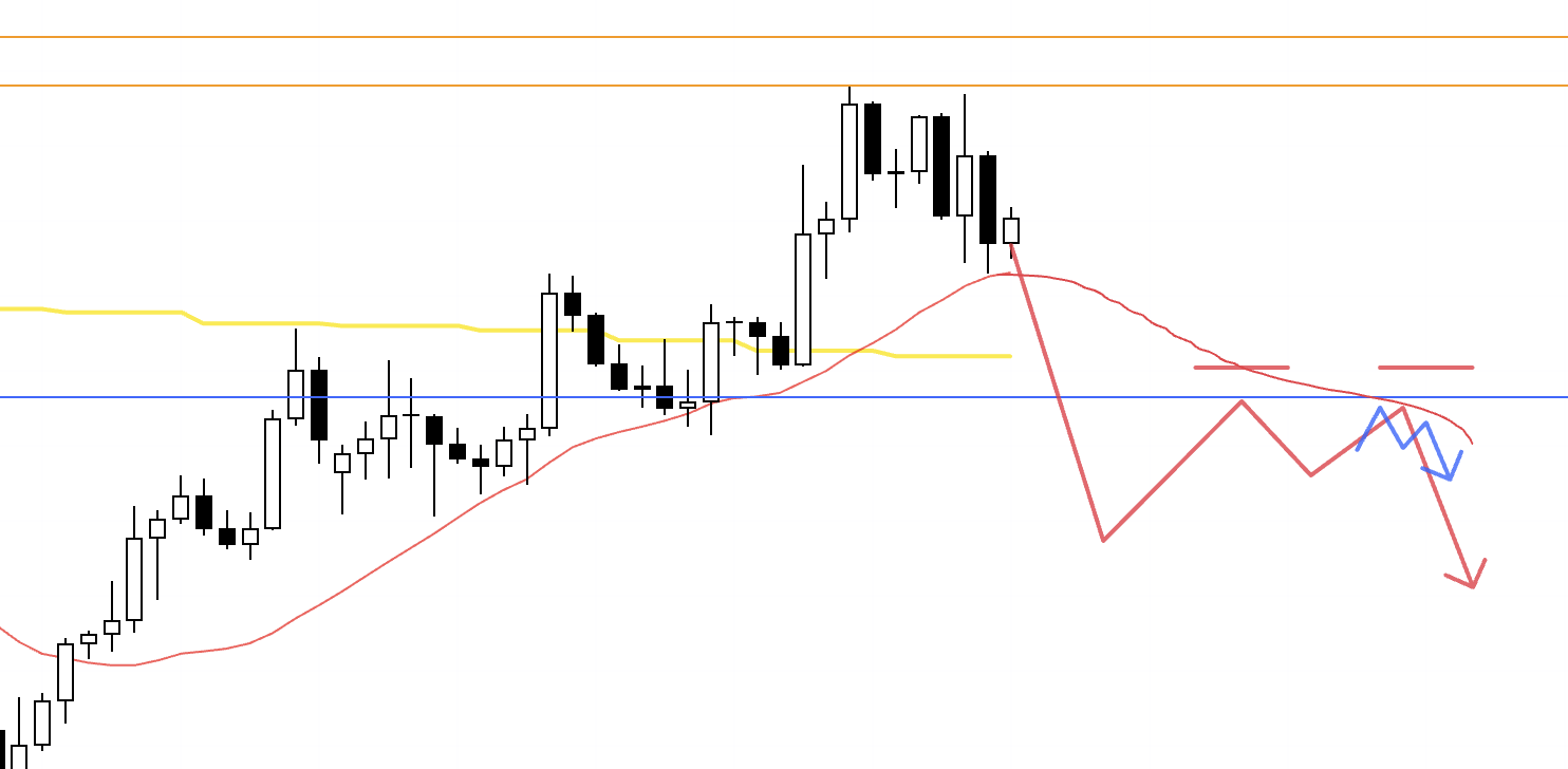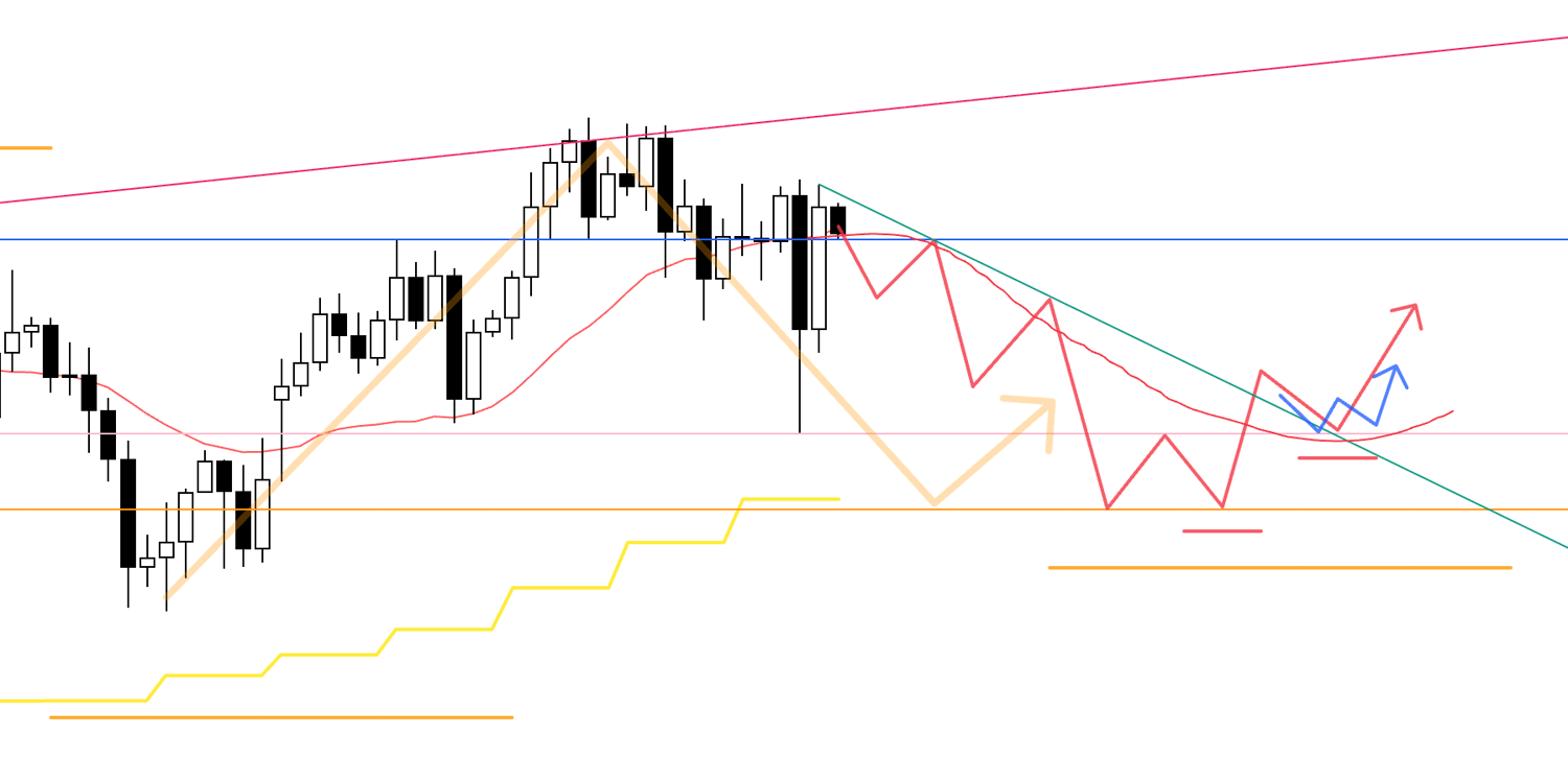 At the same time, if you treat the blue line as the key low, that level has already been broken, so there is a sell-side camp that sees this as a lower high and the start of a downtrend.