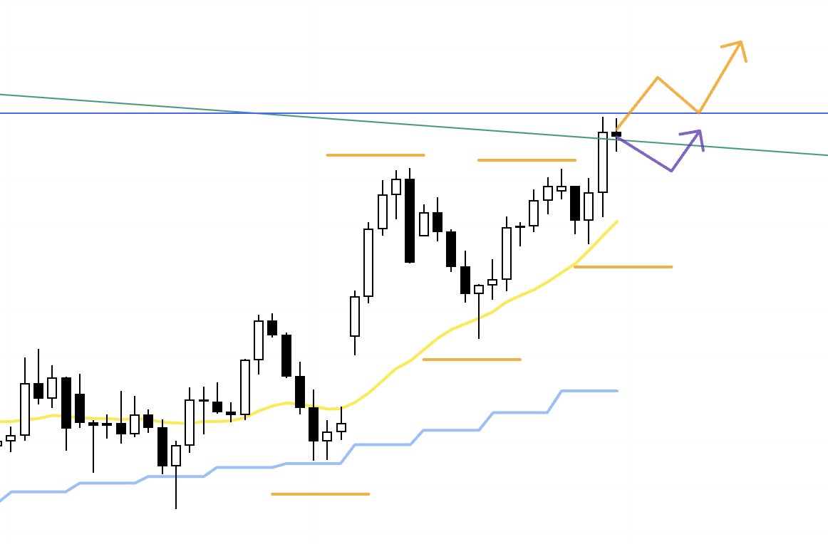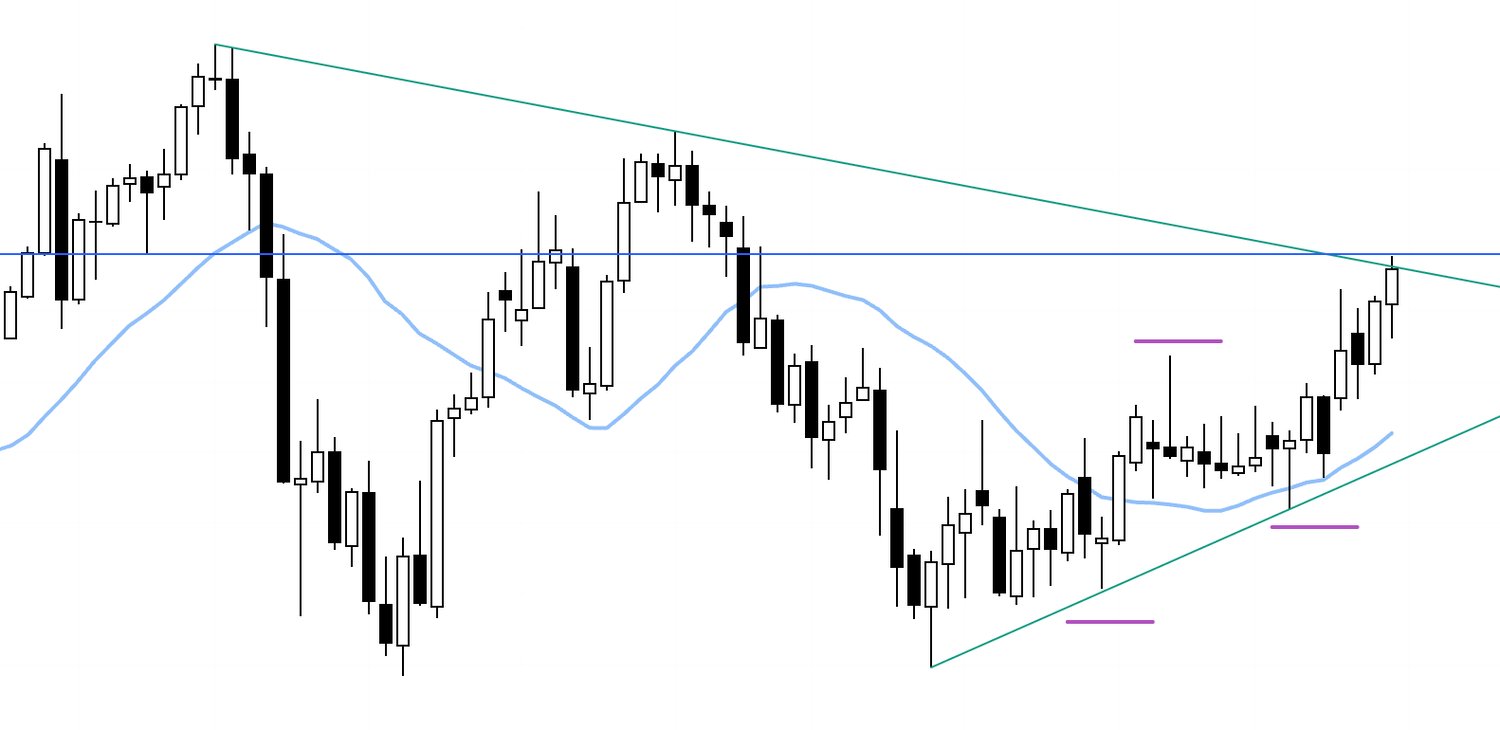 On the weekly chart, price has been printing higher lows and taking out prior highs, extending the uptrend, and has now reached a descending trendline drawn from lower highs visible even on the monthly.