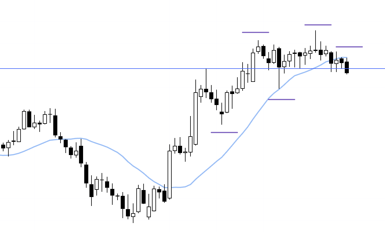 If we extend lower from the weekly open and get stretched away from the daily moving average, a 4h trend rotation higher could become a tactical long.
