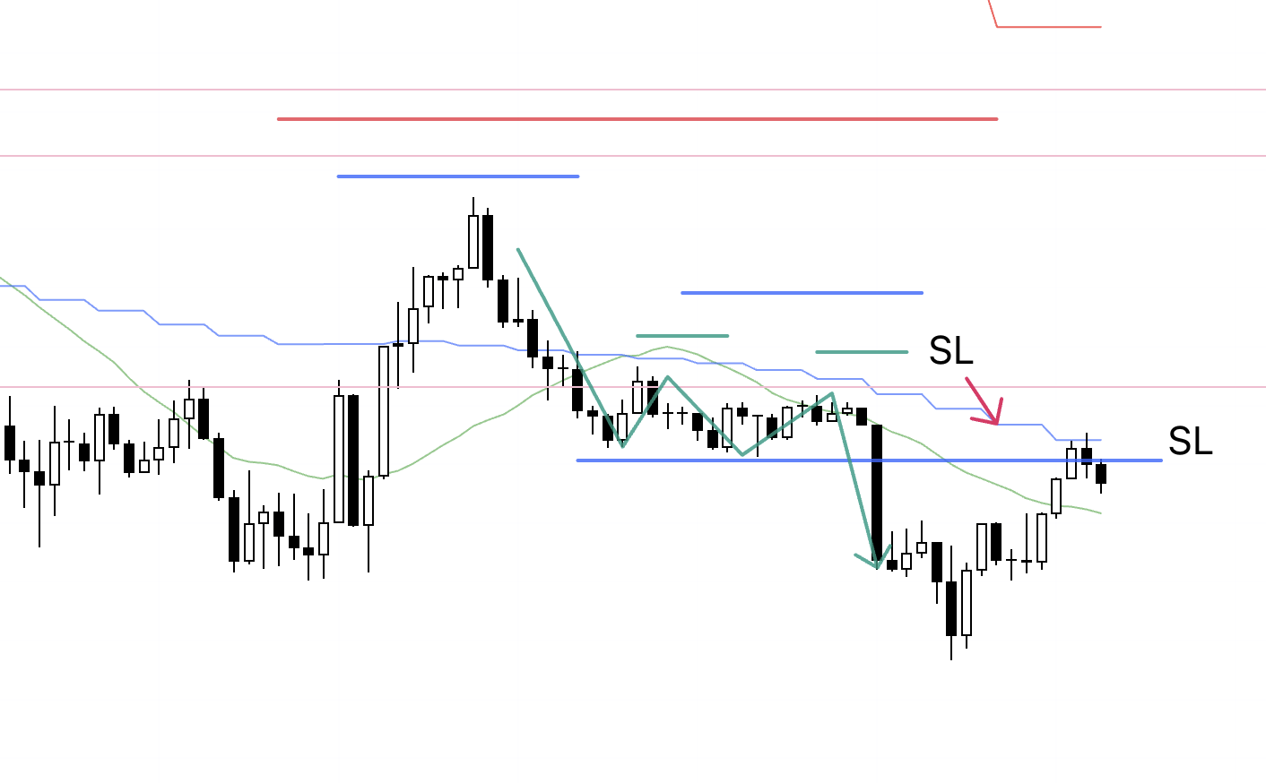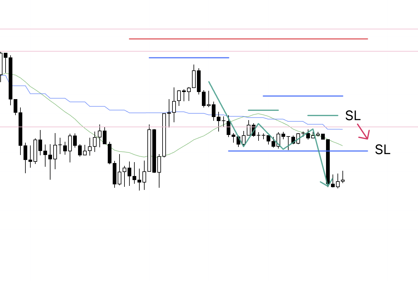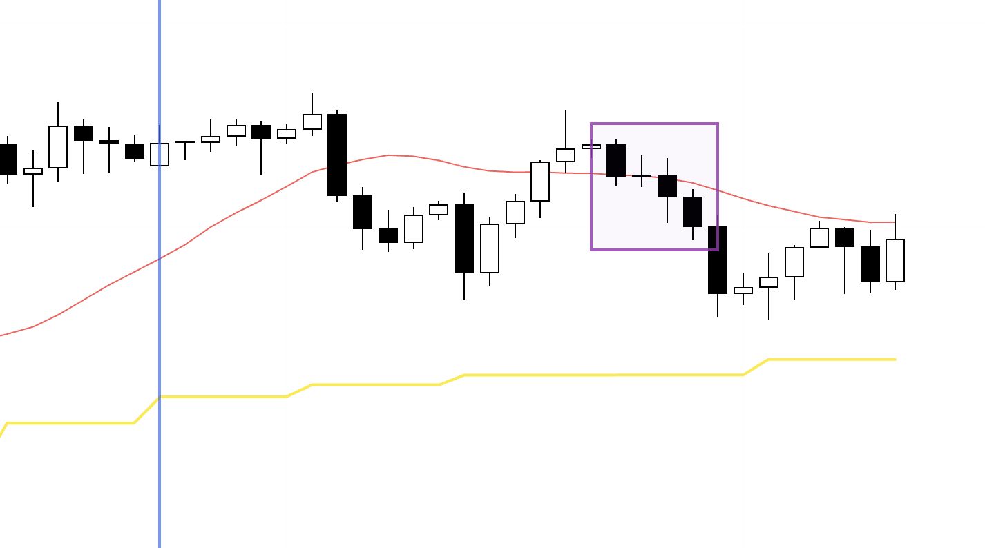 I’ll place the stop below the supported low (the pink line).