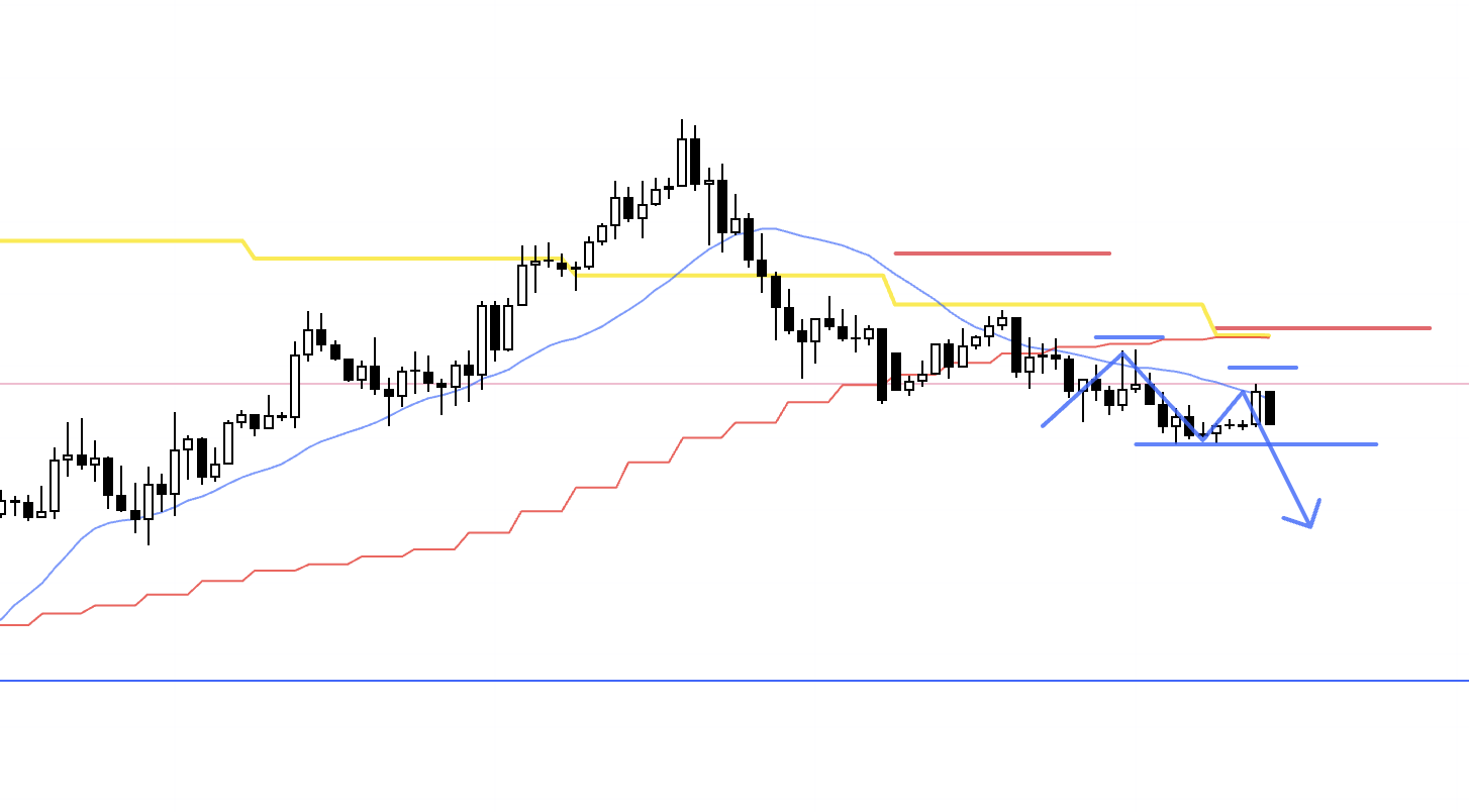 This upswing is the rally that builds the daily lower‑high, meaning it runs counter to the daily downtrend, so I would plan to secure half near the daily MA (yellow).