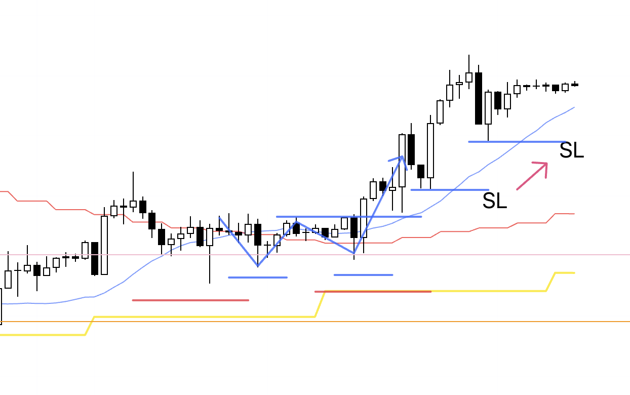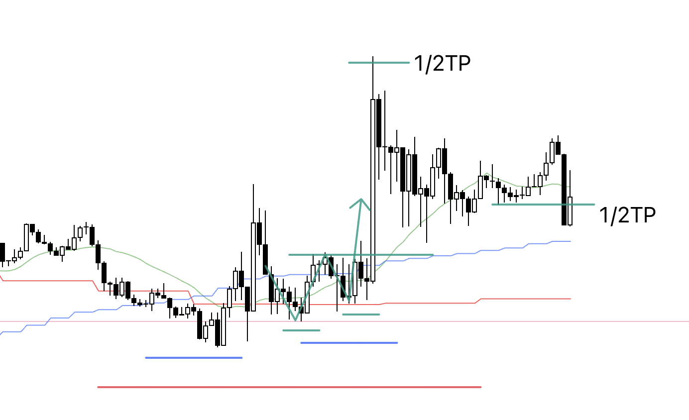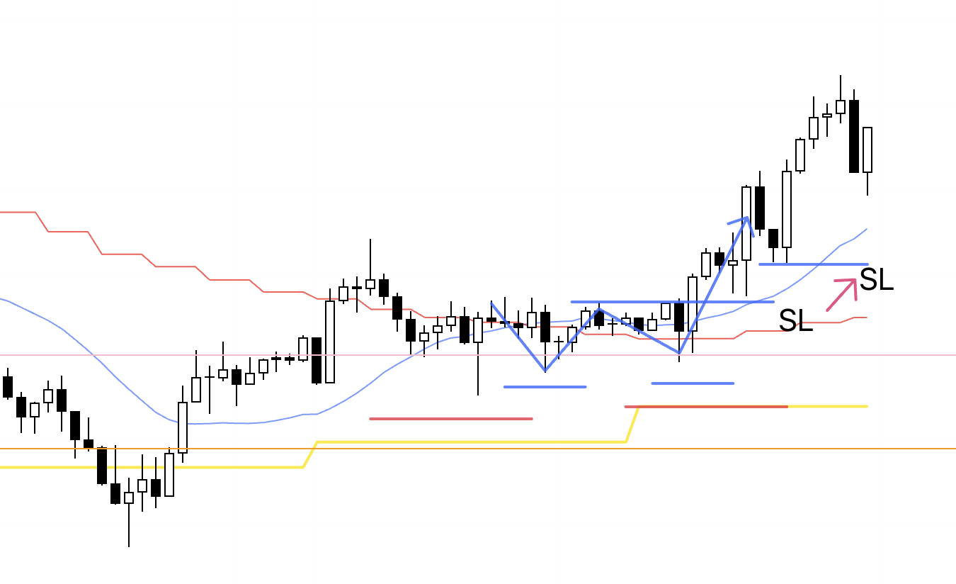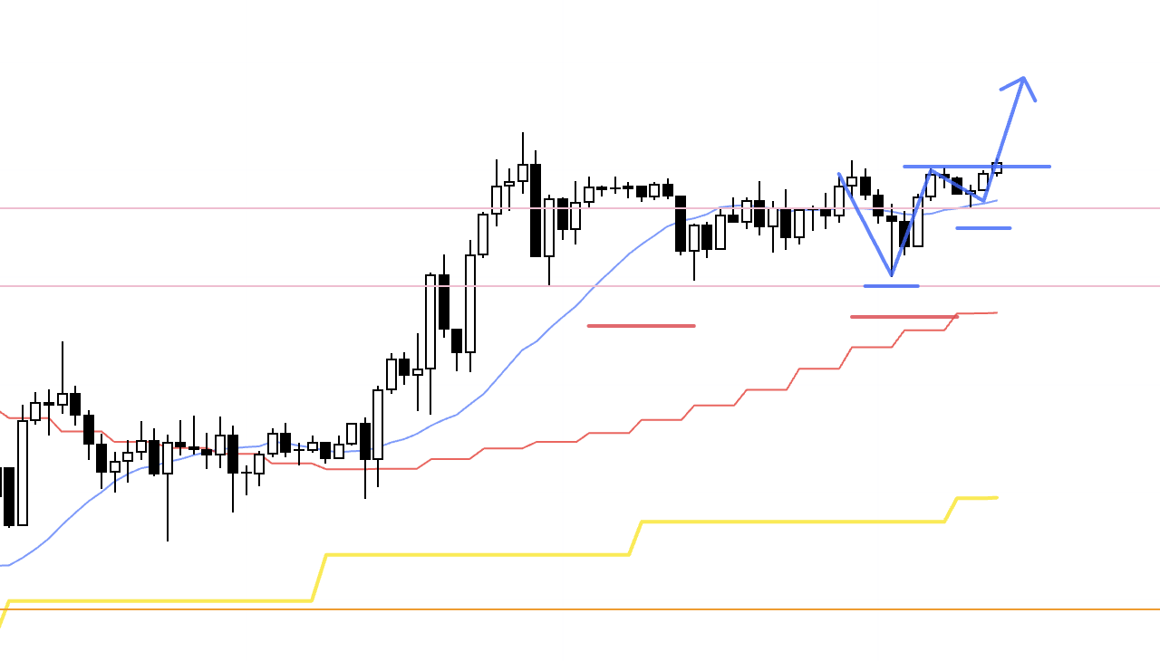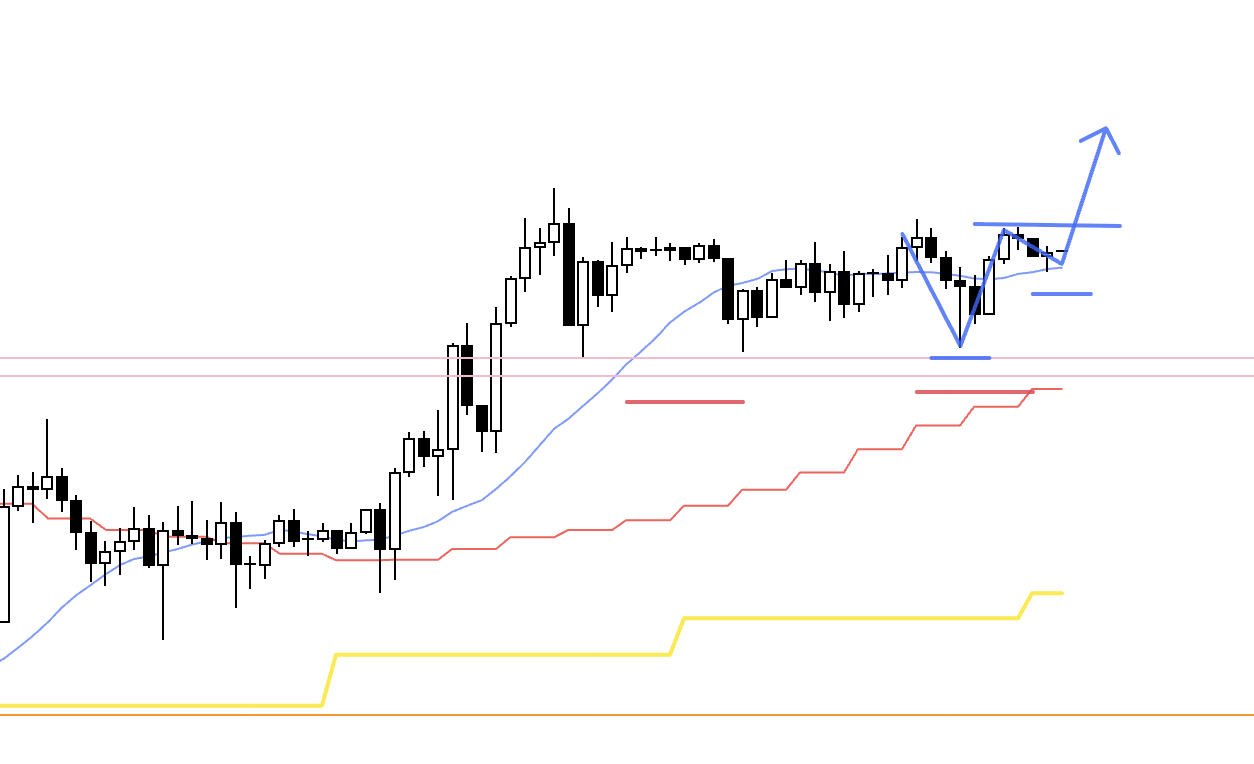 After that, price formed a higher‑low, but at that moment the 4h moving average (red) was still pressing from above, so I couldn’t take the trade.
