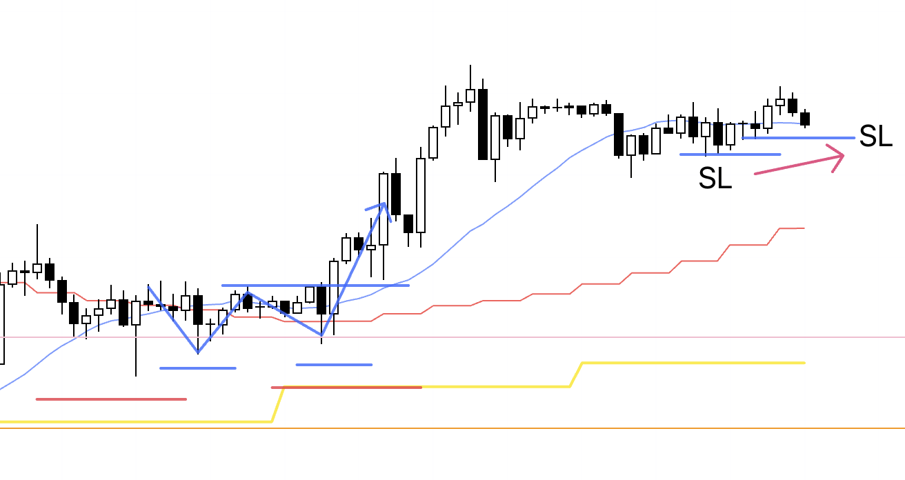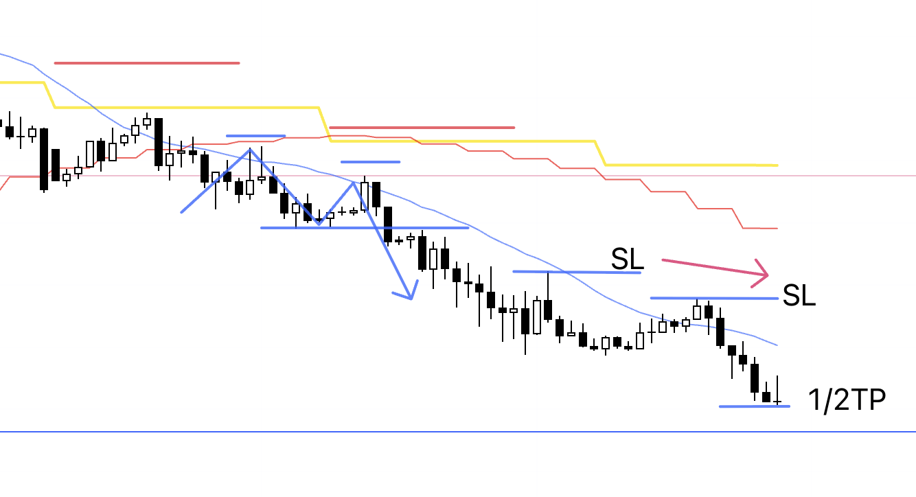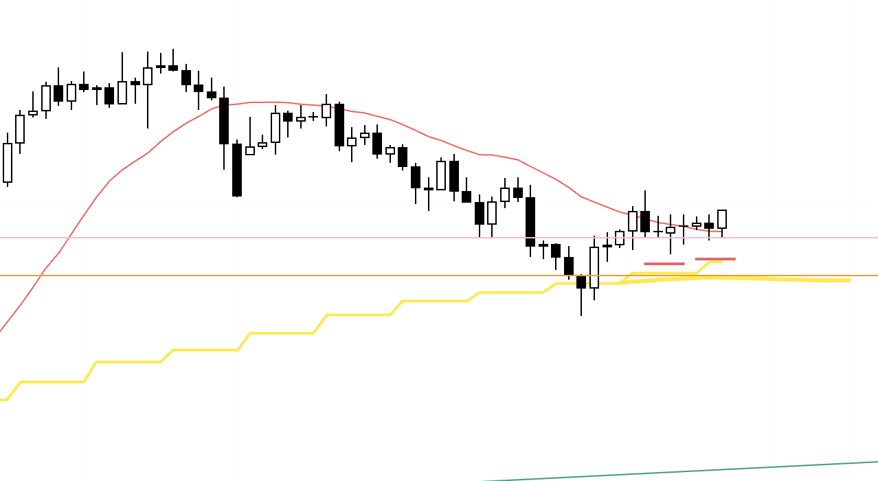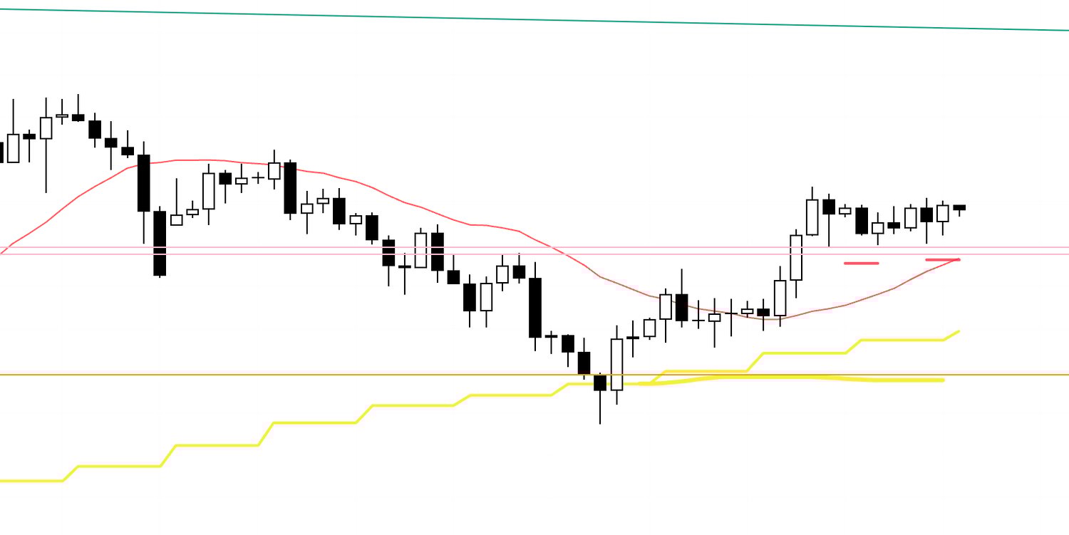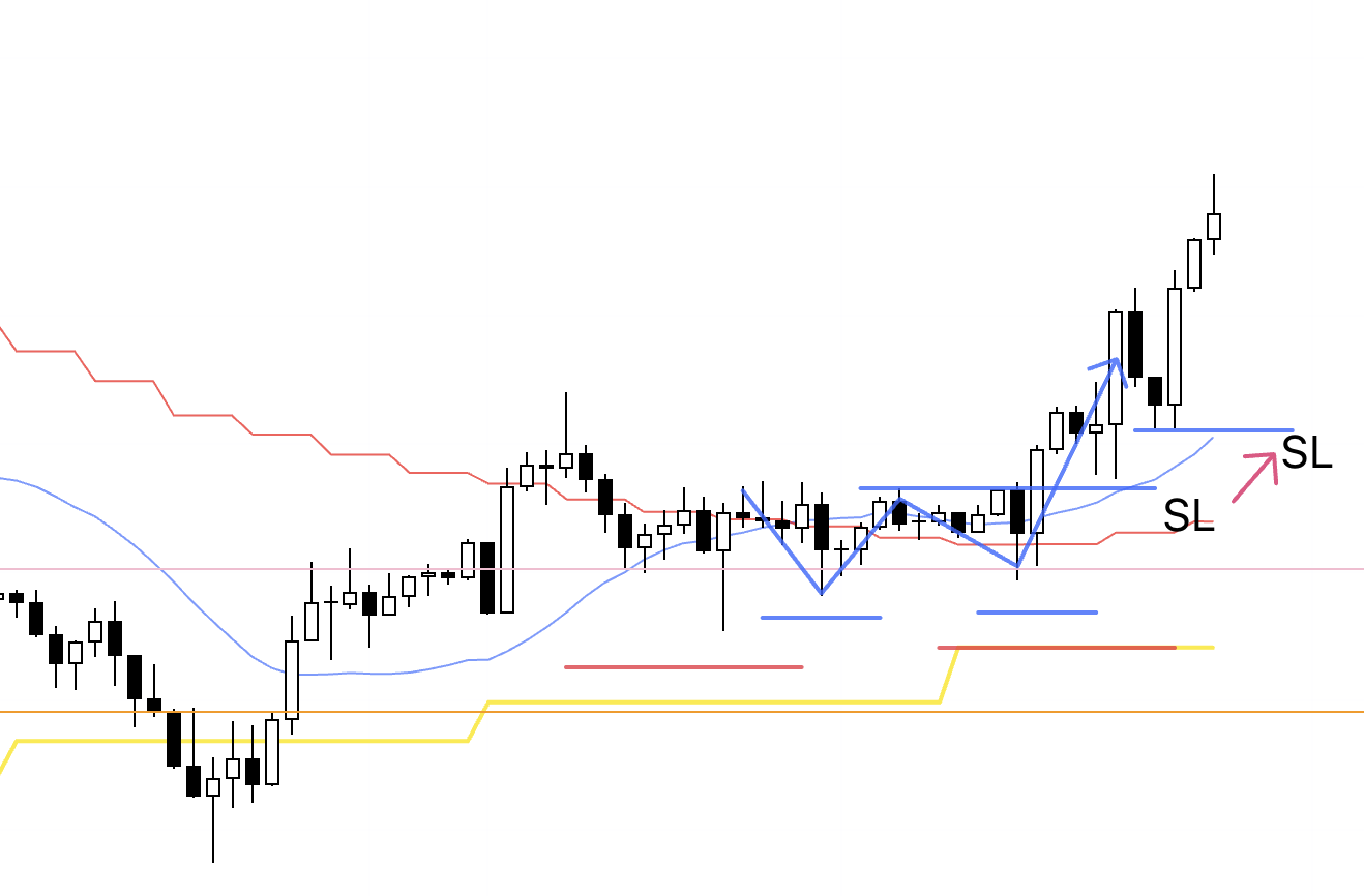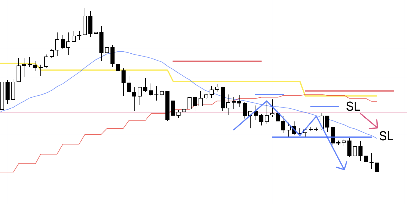 After that, price formed a higher‑low, but at that moment the 4h moving average (red) was still pressing from above, so I couldn’t take the trade.