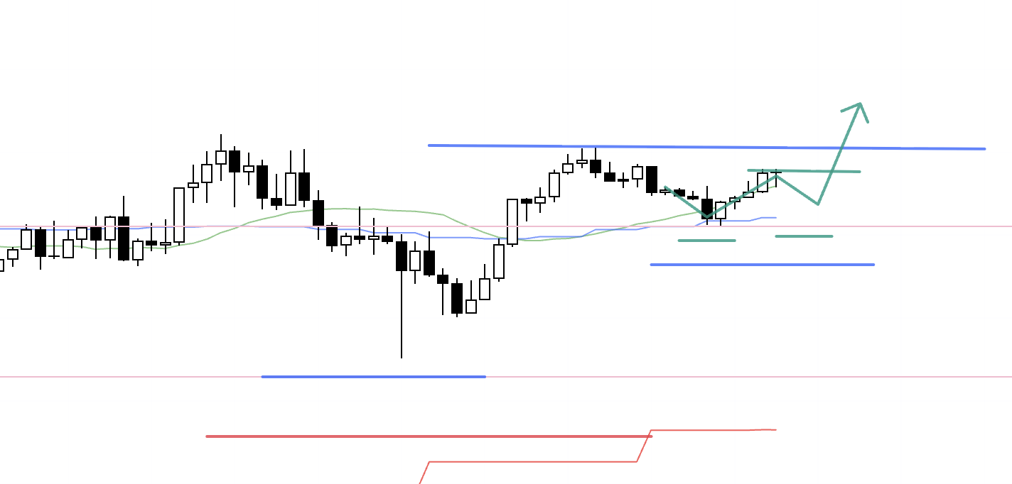 This was the buy scenario I had last Sunday, looking for the 4h downtrend to break, a series of higher‑lows supported by the 4h moving average (red), and—importantly—alignment with a daily higher‑low.