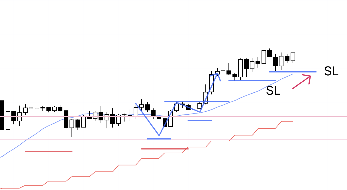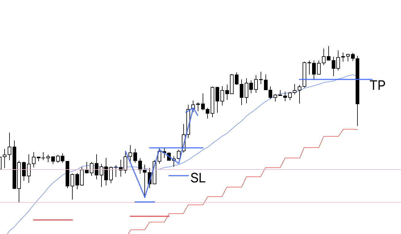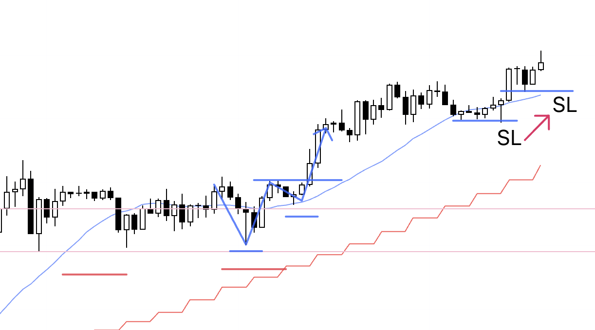 As price prints successive higher‑lows, I raise the stop loss, and the trade ends when trend structure finally breaks and the trailing stop is hit.