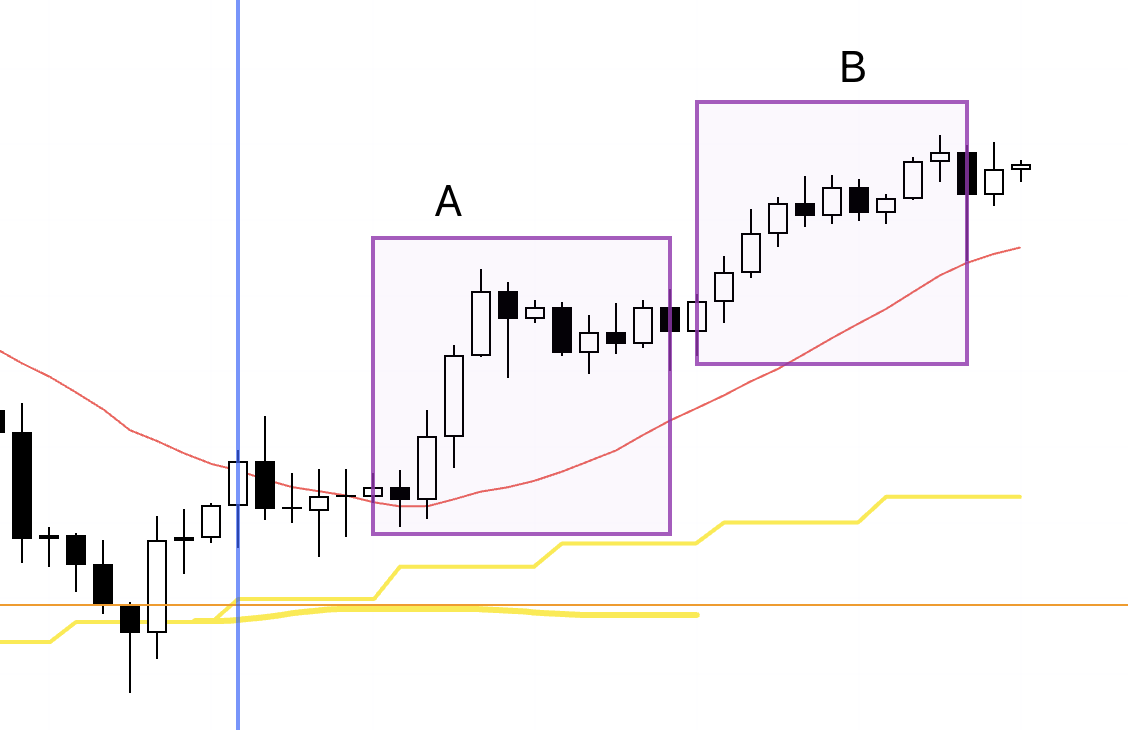Subsequently, another higher‑low formed and the moving average began to support from below, which defines the B low.