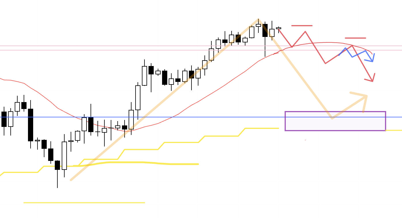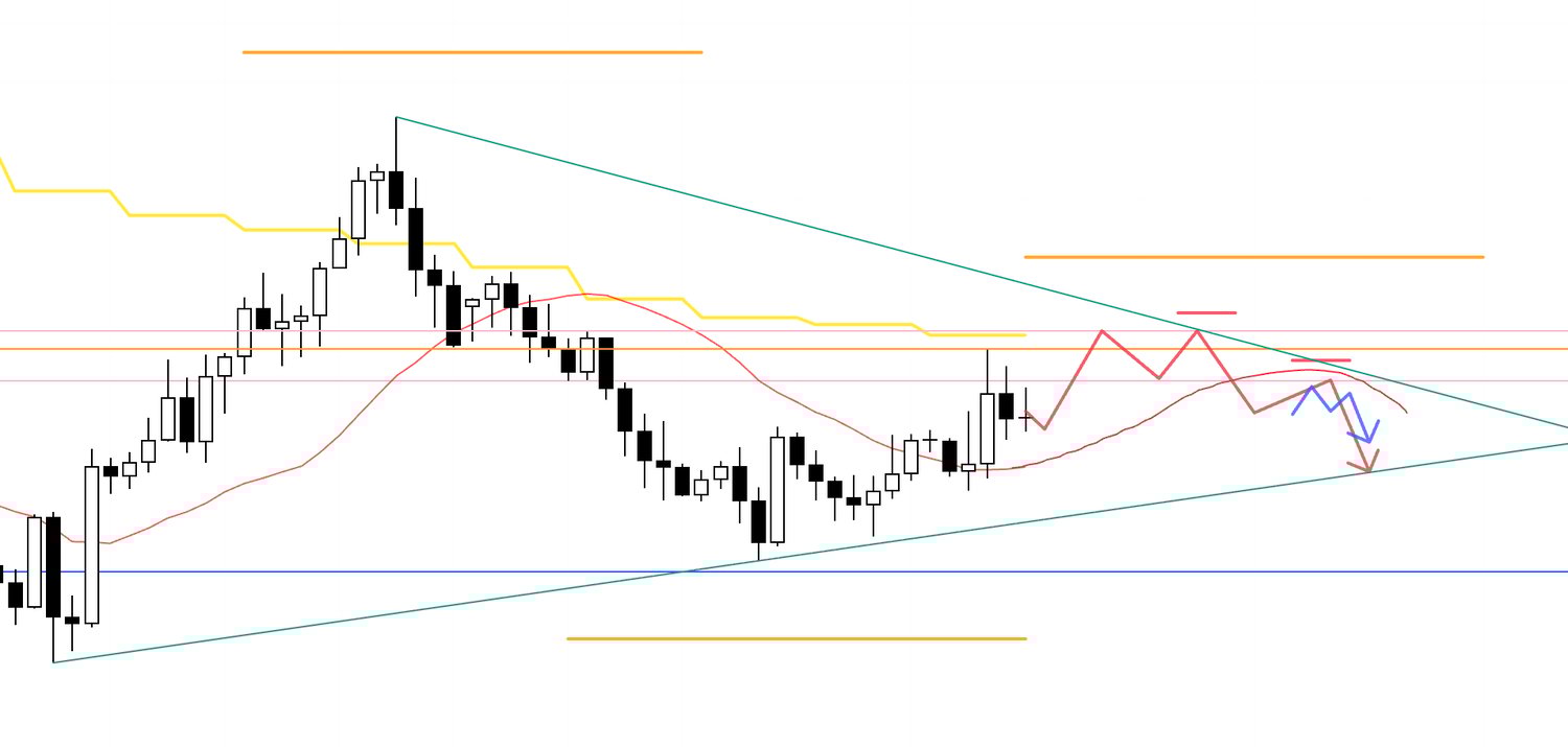 Then, if price retests and is capped by that blue line, a trendline, or the moving averages while forming a lower‑high pivot, I will look to sell.