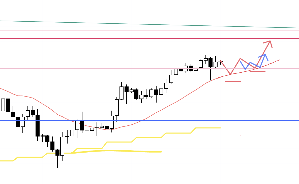 It’s less obvious on the weekly, but on the daily there are two red lines that mark levels likely to draw attention, and where these red lines overlap with the green trendline, selling pressure may increase.