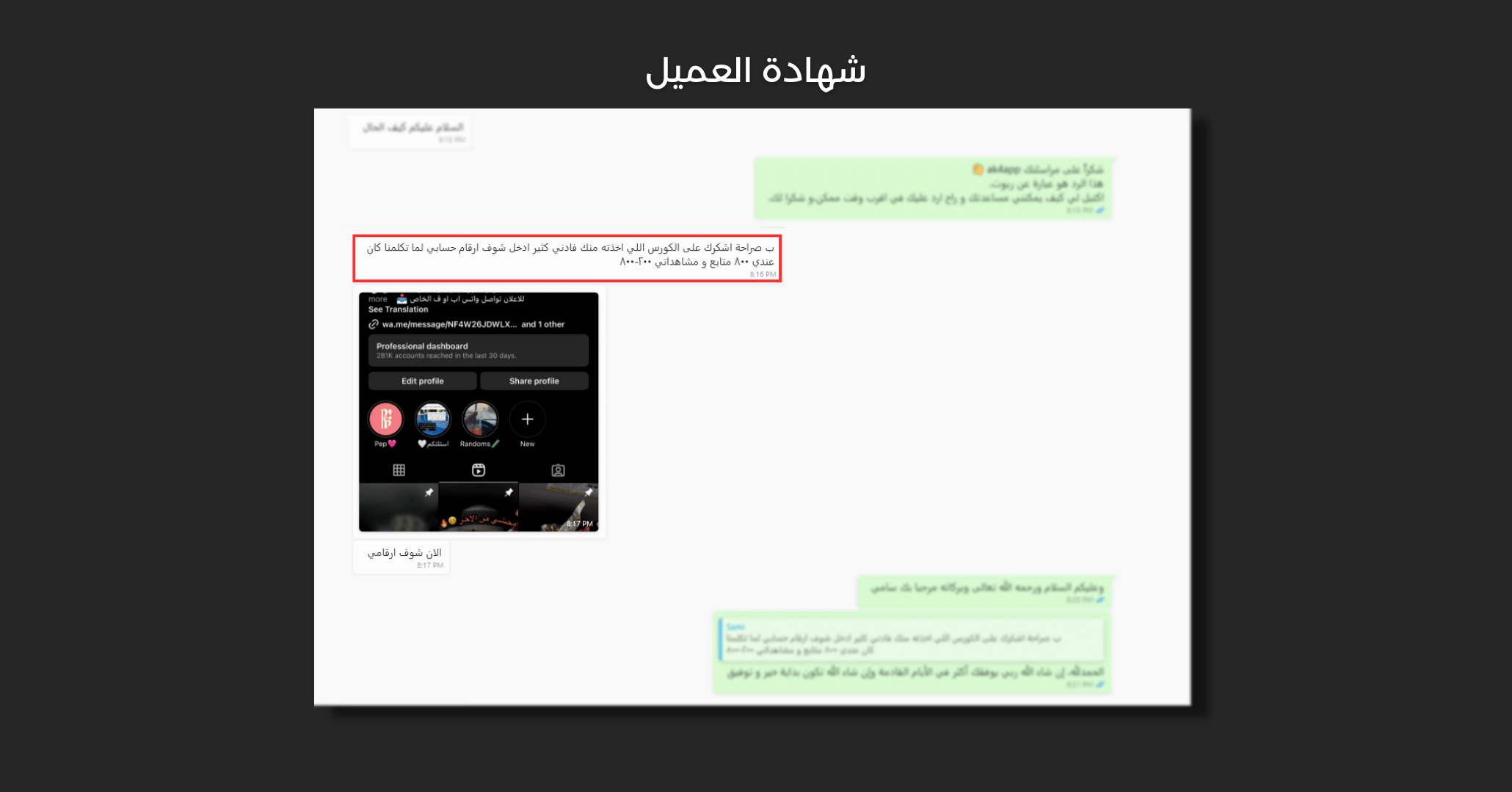 ب صراحة اشكرك على الكورس اللي اخذته منك فادني كثير ادخل شوف ارقام حسابي لما تكلمنا كان عندي ٨٠٠ متابع و مشاهداتي ٢٠٠-٨٠٠