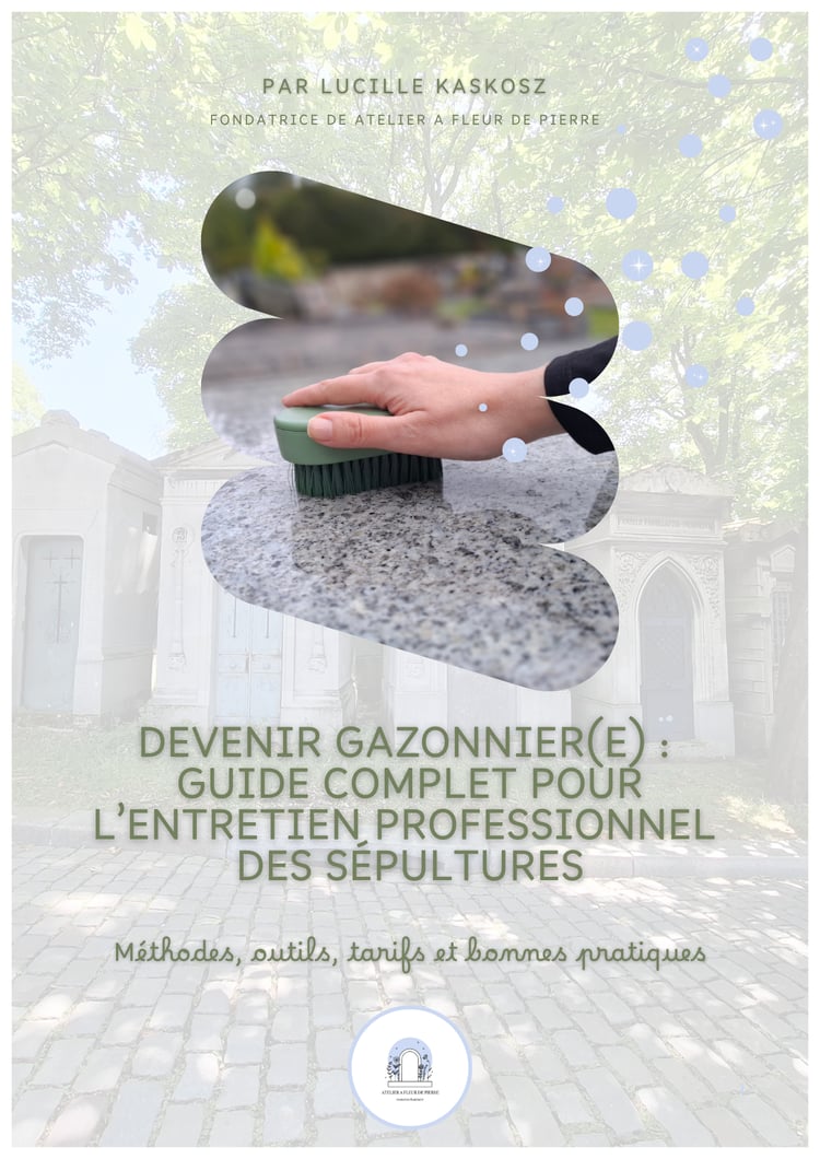 Je m'appelle Lucille, j'habite dans le Val de Marne (94). J'ai créé ma micro entreprise "Atelier A fleur de pierre", où je travaille en tant que gazonnière : je prends soin des sépultures au sein des cimetières d'ile de France.