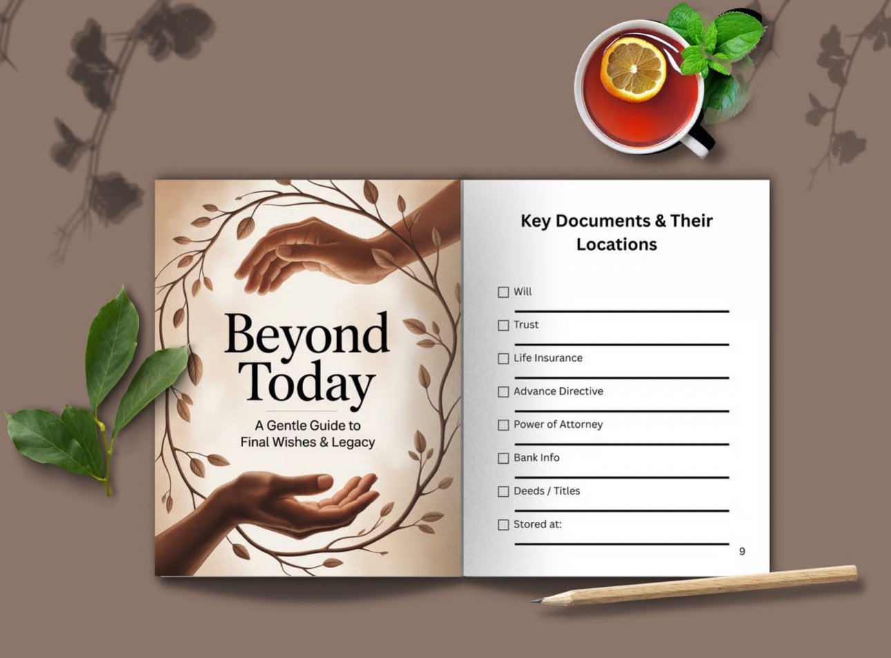 Beyond Today is a crafted legacy planning book designed to bring clarity, peace, and meaning to one of life’s most tender transitions. Thoughtfully structured and gentle in tone, it guides you step-by-step through documenting your final wishes, essential information, personal reflections, and cherished memories.