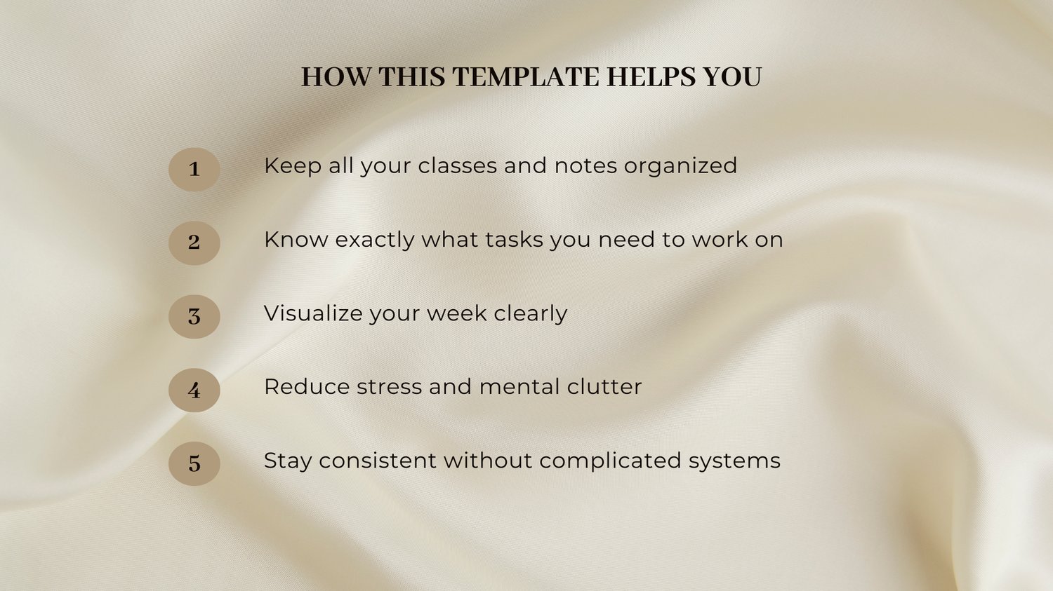 This template is not a rigid or complicated system. It’s a flexible academic hub where you can manage your classes, notes, tasks, and weekly schedule all in one place.