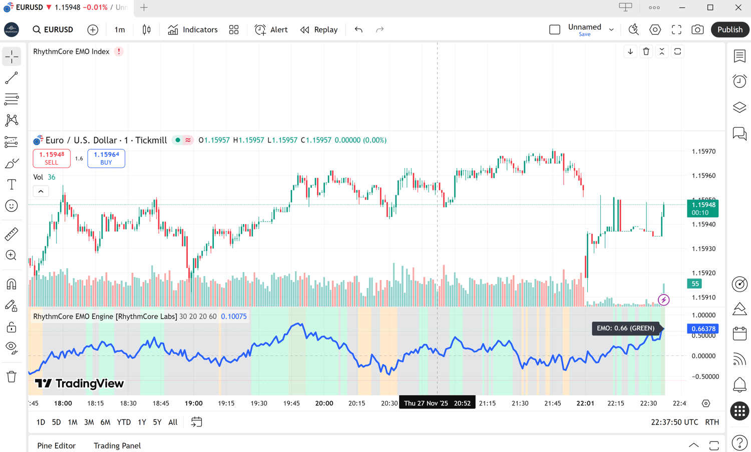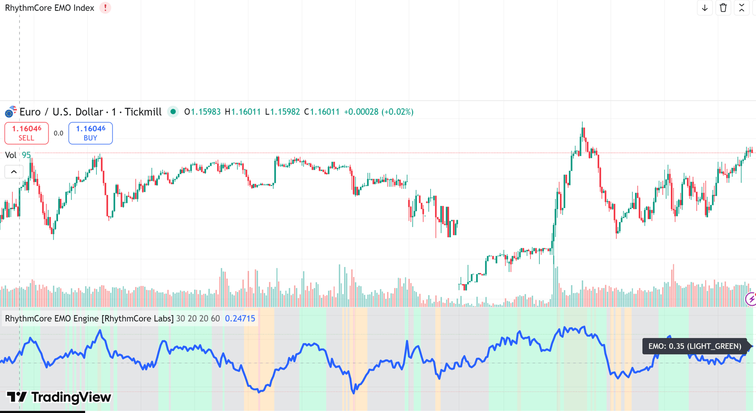 The RhythmCore Emo Engine is a TradingView Pine Script indicator that displays EMO Index, EMO Zones, emotional volatility, trend pressure, and market regime states.
