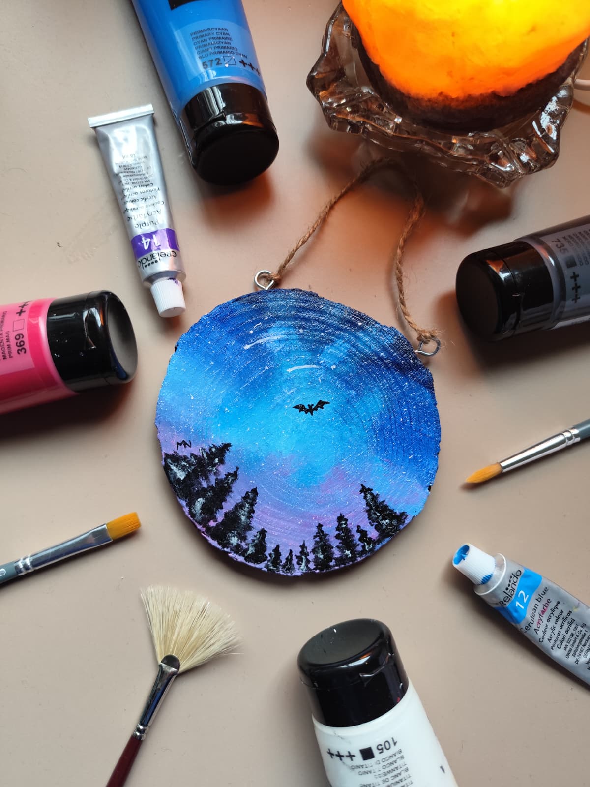 Esta pieza en madera captura dos momentos llenos de encanto en una sola obra. Por un lado, una noche en calma donde un murciélago sobrevuela en silencio, creando una escena serena y con un toque misterioso.