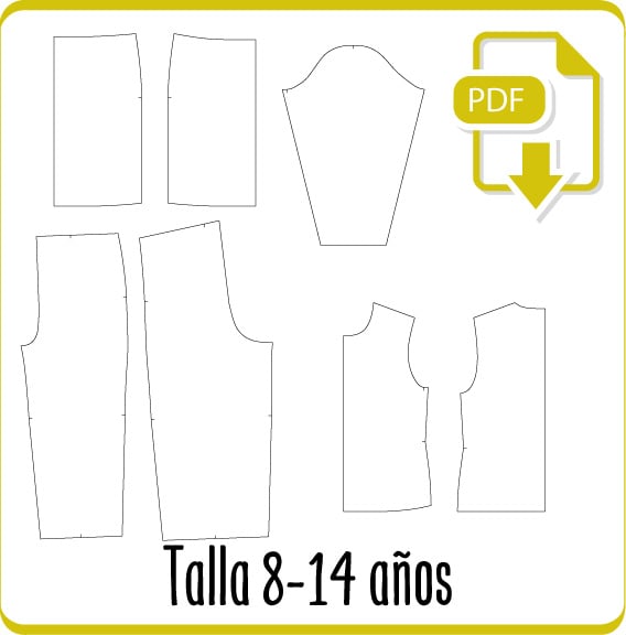 Patrones base infantiles de falda, cuerpo y pantalón, de las tallas 8 a 14 años.