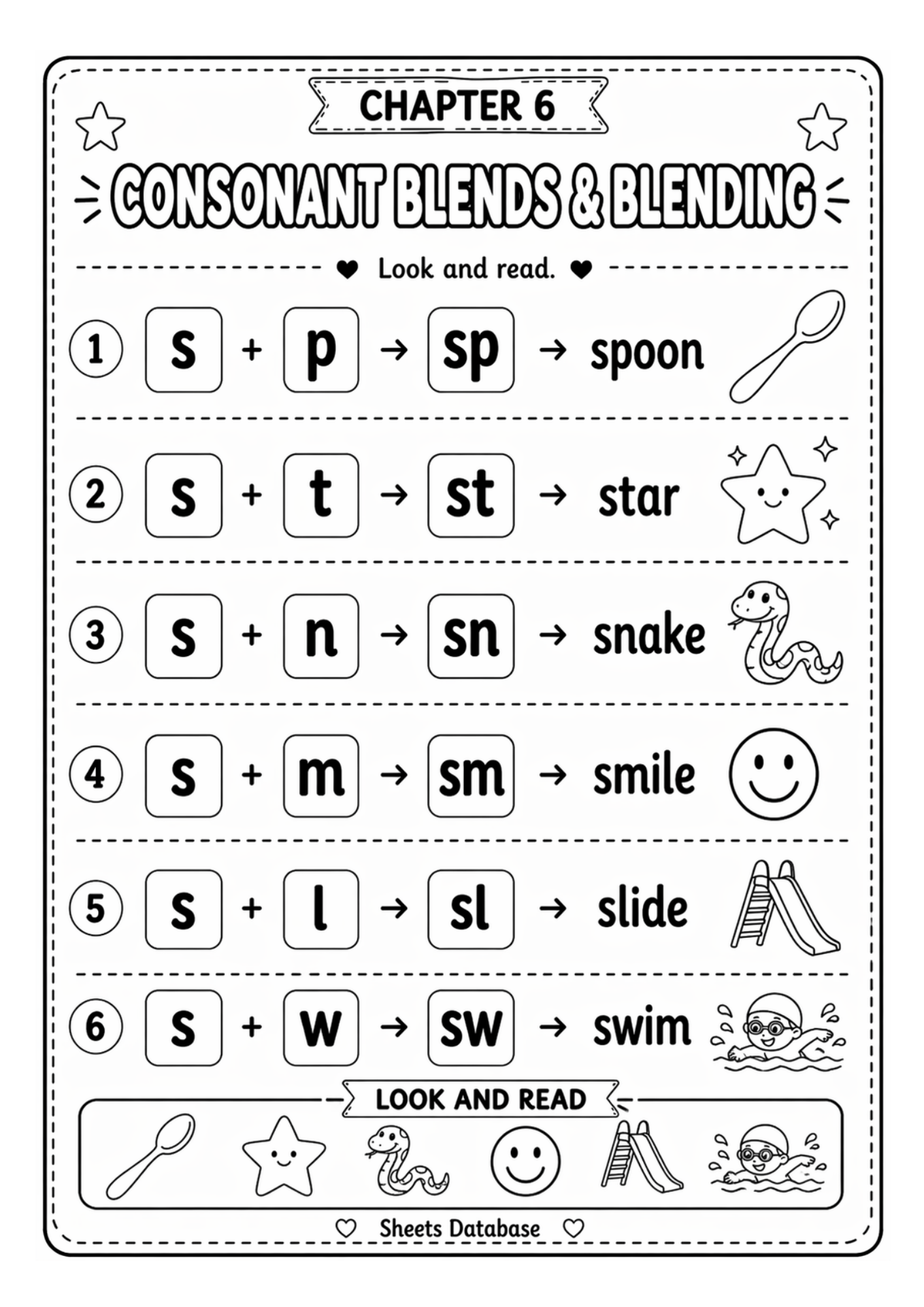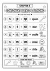 - Consonant blends (bl, cl, fl, cr, tr, gr, sn, sm, st, sp)