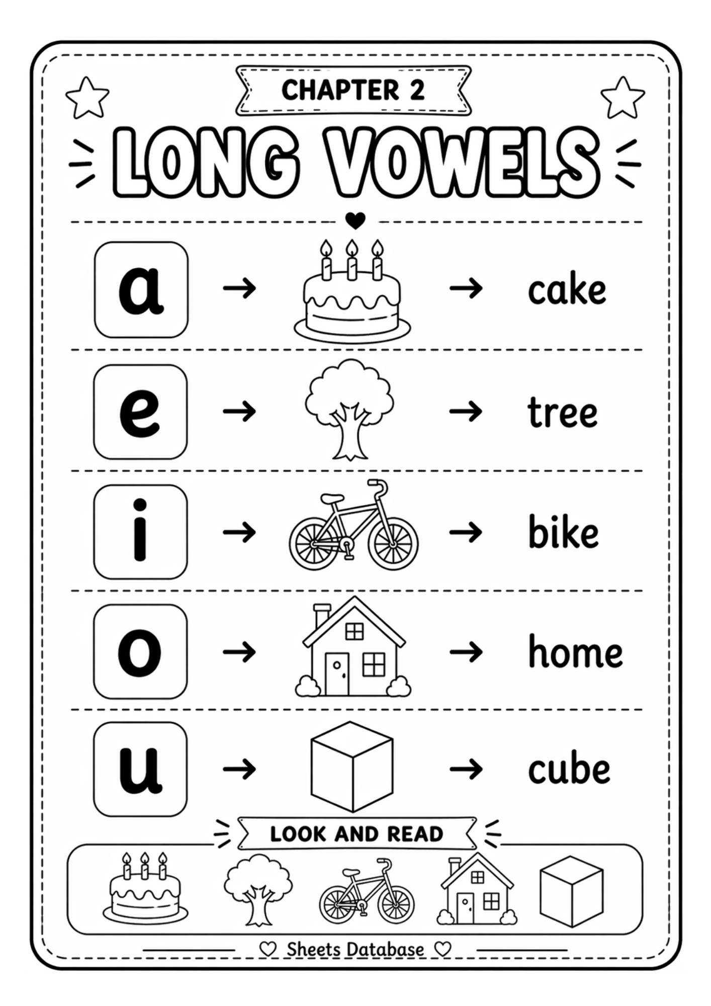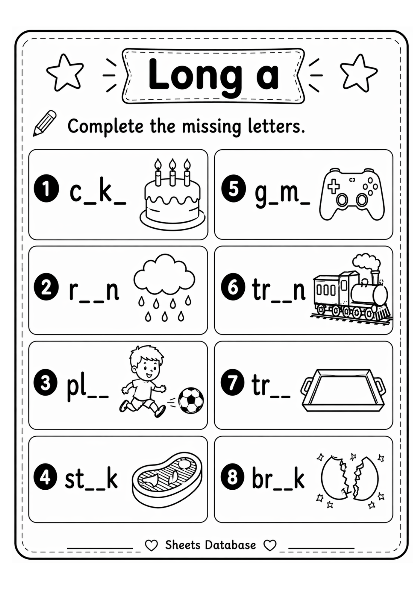 - Phonics patterns (a_e, ee, igh, oa, o_e, etc.)